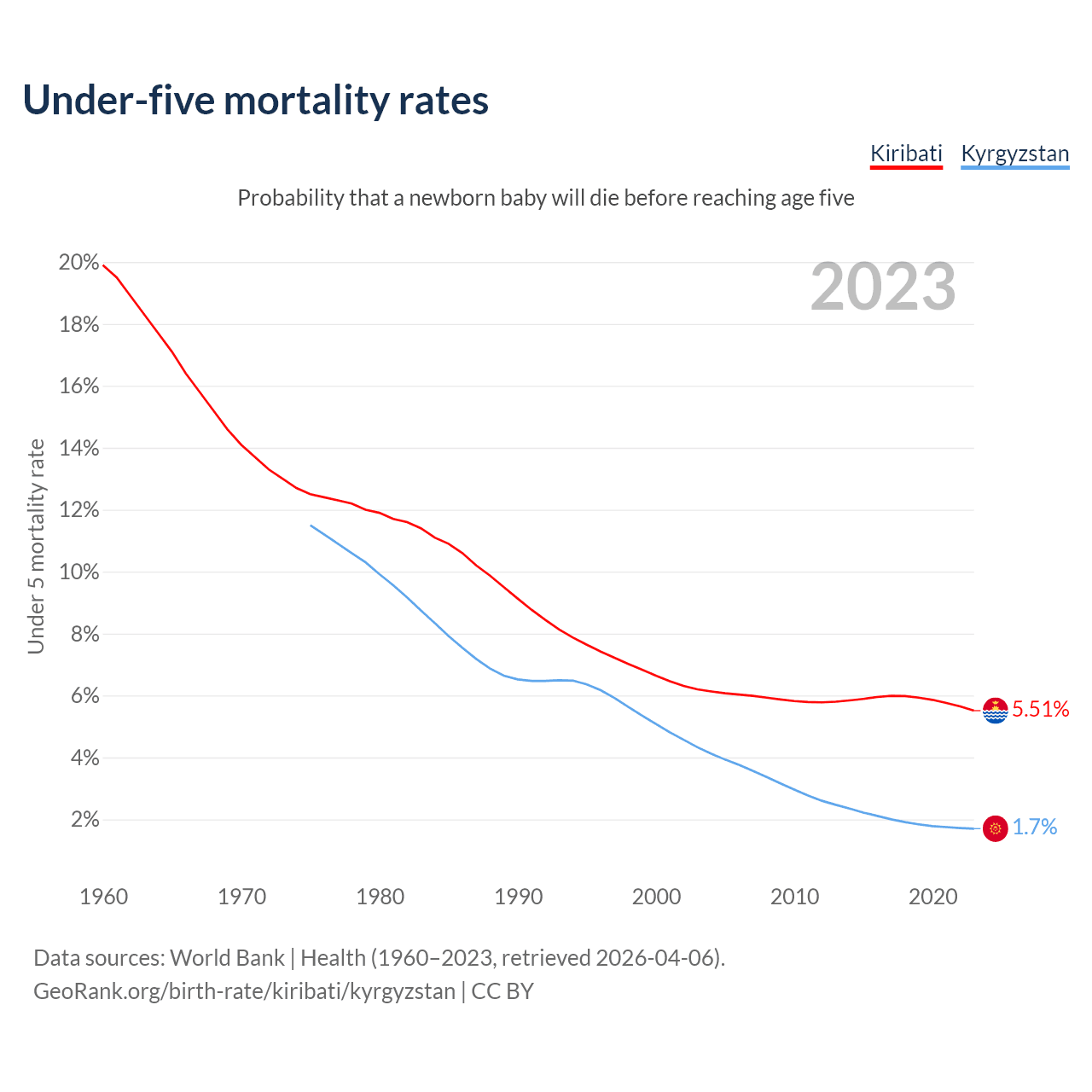 The chance that a newborn baby will die before reaching age five is 5.51% in Kiribati and 1.7% in Kyrgyzstan. Above is a chart with historical data on under-five mortality rates.