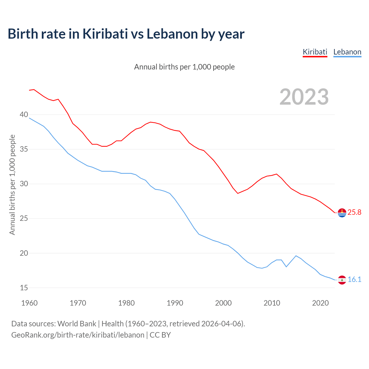 Kiribati has an annual birth rate of 25.8 births per 1,000 people, compared to 16.1 for Lebanon. The average number of children a woman is expected to have during her lifetime — the fertility rate, is 3.15 in Kiribati and 2.24 in Lebanon — 28.9% difference.