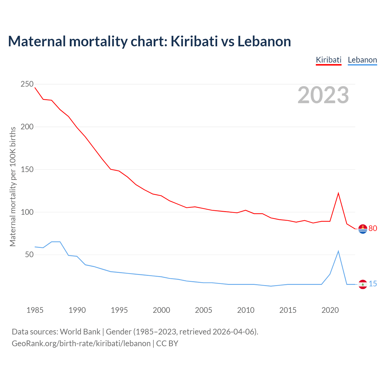 The maternal mortality rate, which is the probability of dying during childbirth or within 42 days of pregnancy termination, is 80 deaths per 100,000 live births in Kiribati, compared to 15 deaths in Lebanon.
