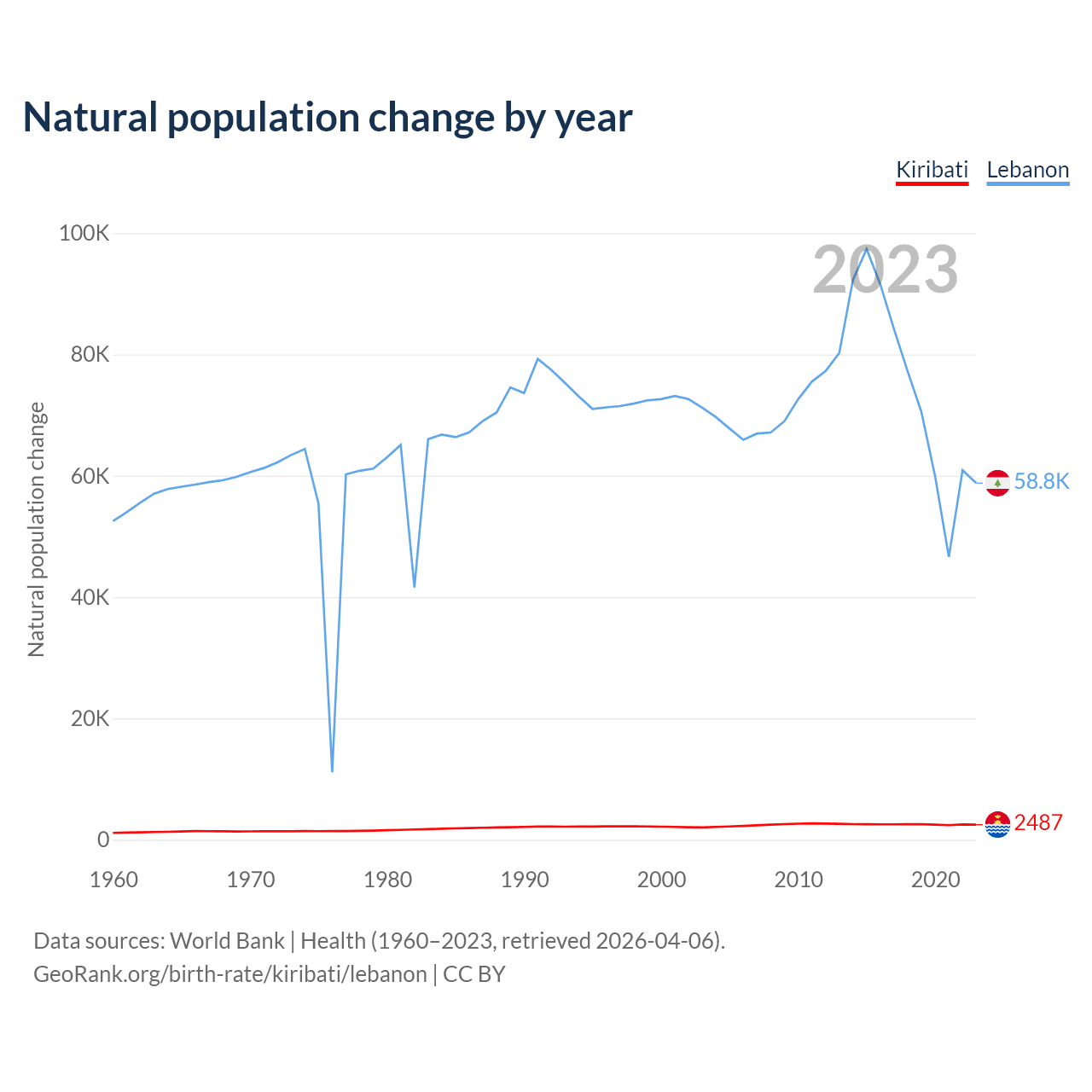 According to the latest available data on birth rates, the fertility rate in Kiribati was 3.15 children per woman in 2023, compared to 2.24 in Lebanon in 2023. The replacement level is considered to be 2.1 children per woman.