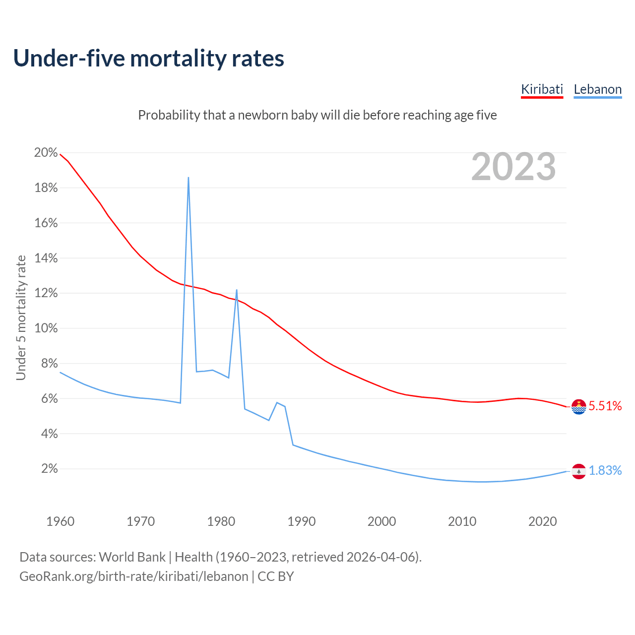 The chance that a newborn baby will die before reaching age five is 5.51% in Kiribati and 1.83% in Lebanon. Above is a chart with historical data on under-five mortality rates.