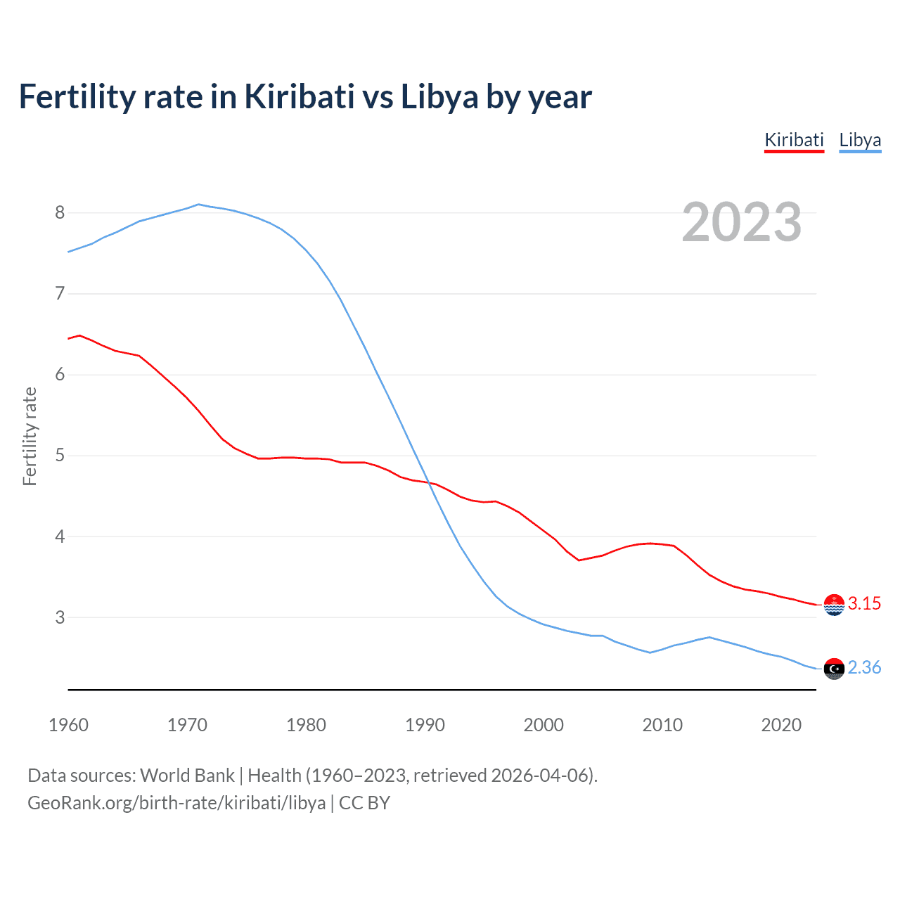 1960 vs 2023, the fertility rate has decreased by 51.1% in Kiribati and by 68.6% in Libya — in 1960, it was 6.44 and 7.51, respectively.