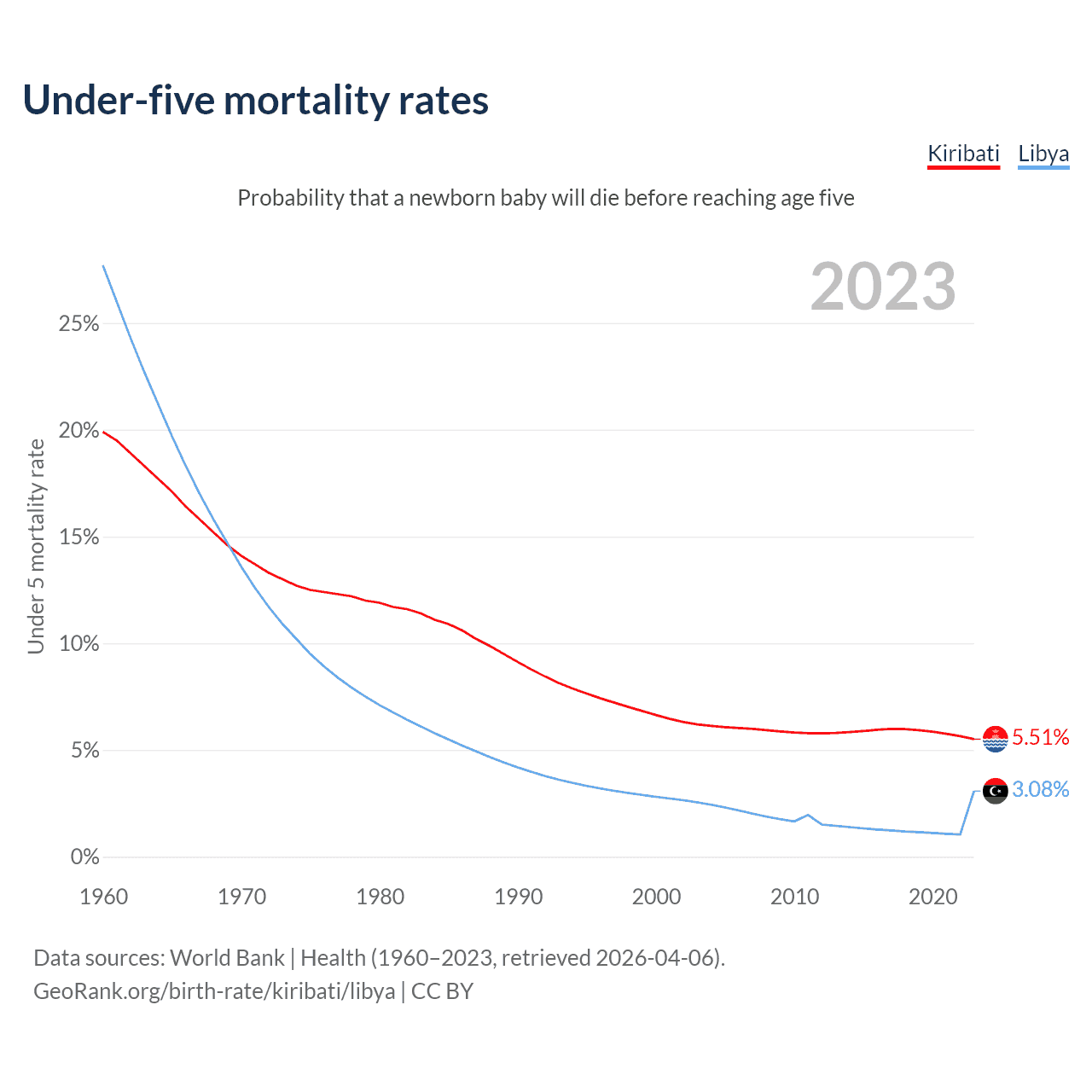 The chance that a newborn baby will die before reaching age five is 5.51% in Kiribati and 3.08% in Libya. Above is a chart with historical data on under-five mortality rates.