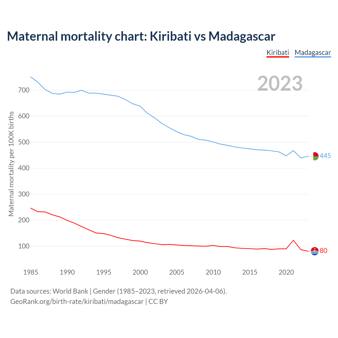 The maternal mortality rate, which is the probability of dying during childbirth or within 42 days of pregnancy termination, is 80 deaths per 100,000 live births in Kiribati, compared to 445 deaths in Madagascar.