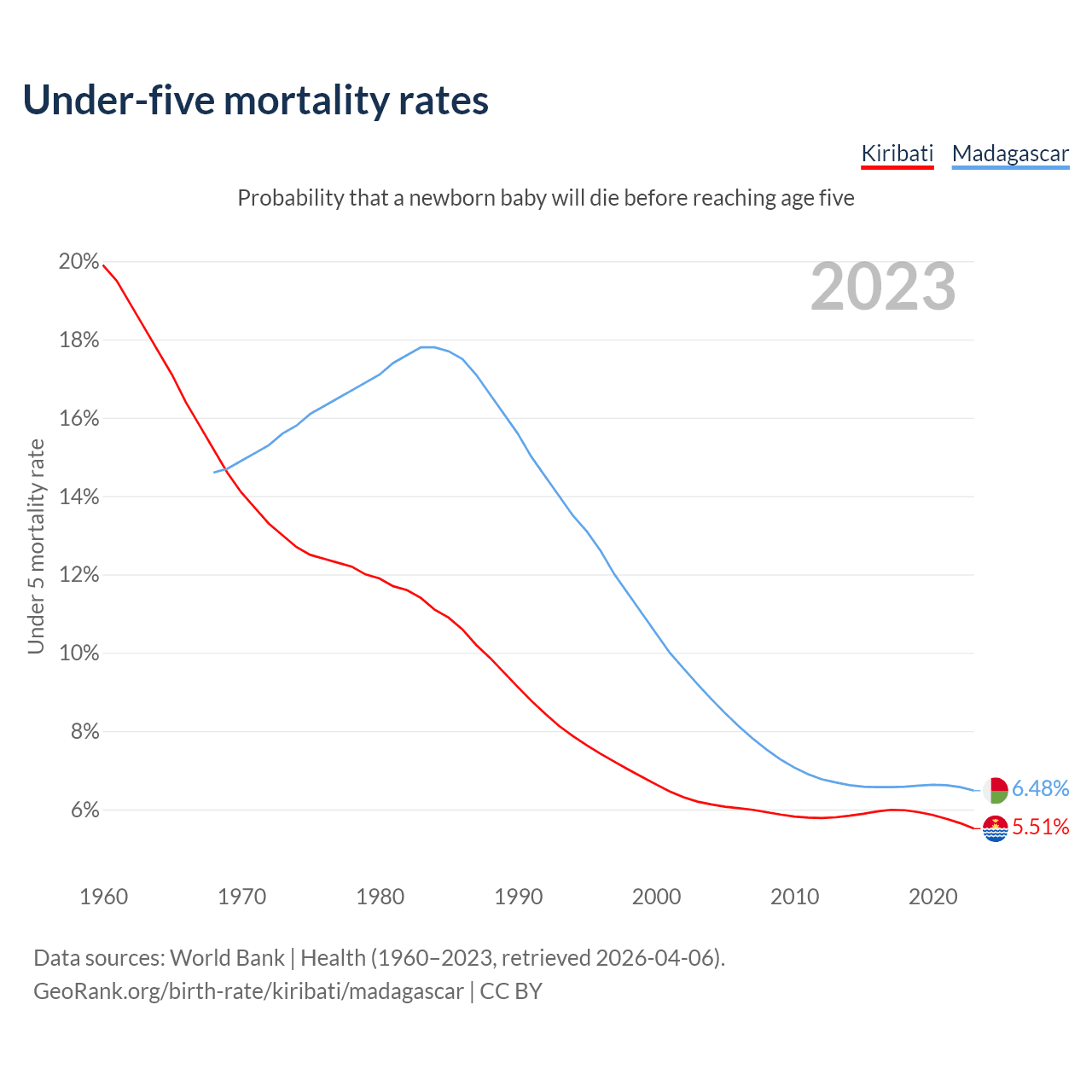 The chance that a newborn baby will die before reaching age five is 5.51% in Kiribati and 6.48% in Madagascar. Above is a chart with historical data on under-five mortality rates.