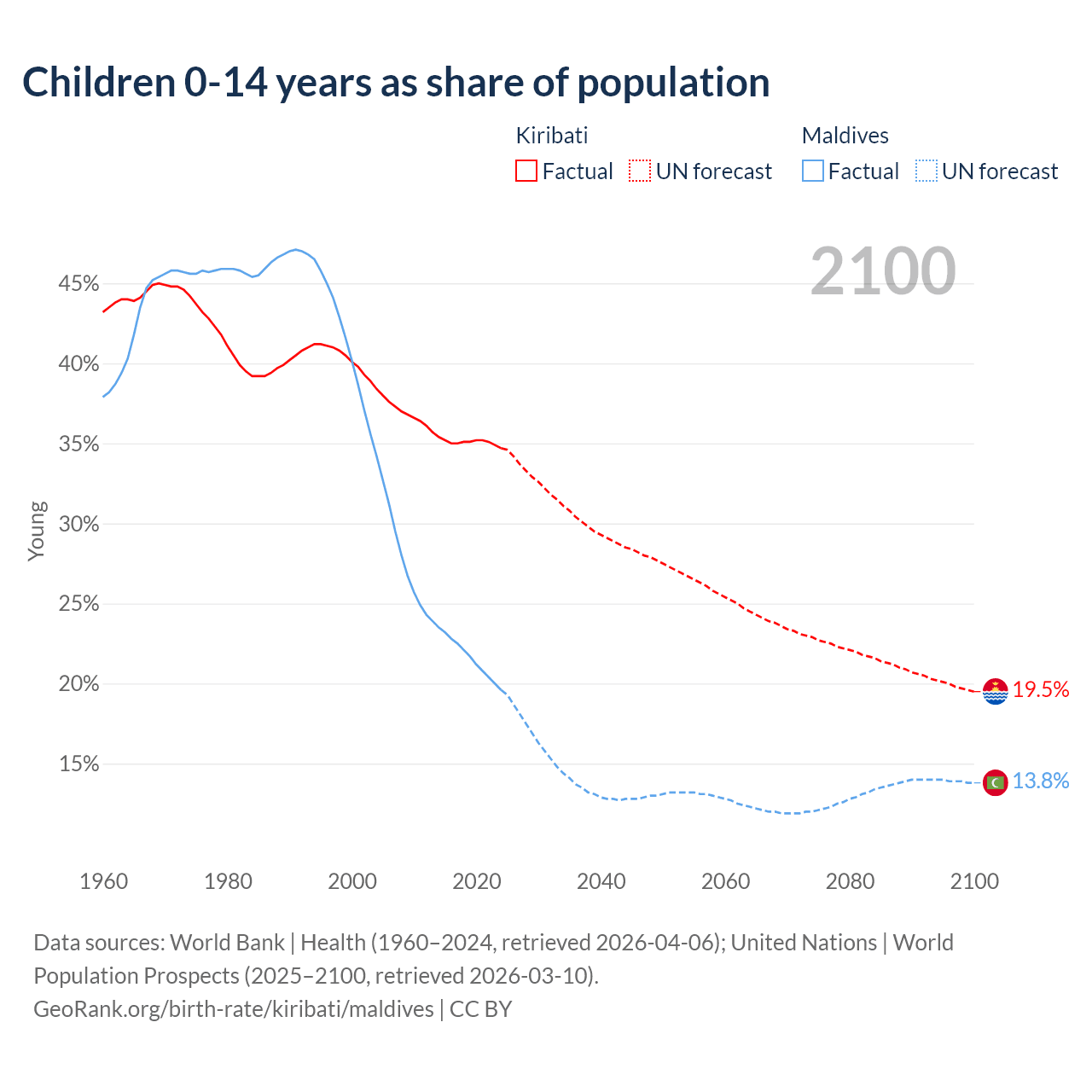 According to the latest available data on birth rates, the fertility rate in Kiribati was 3.15 children per woman in 2023, compared to 1.58 in Maldives in 2023. The replacement level is considered to be 2.1 children per woman.