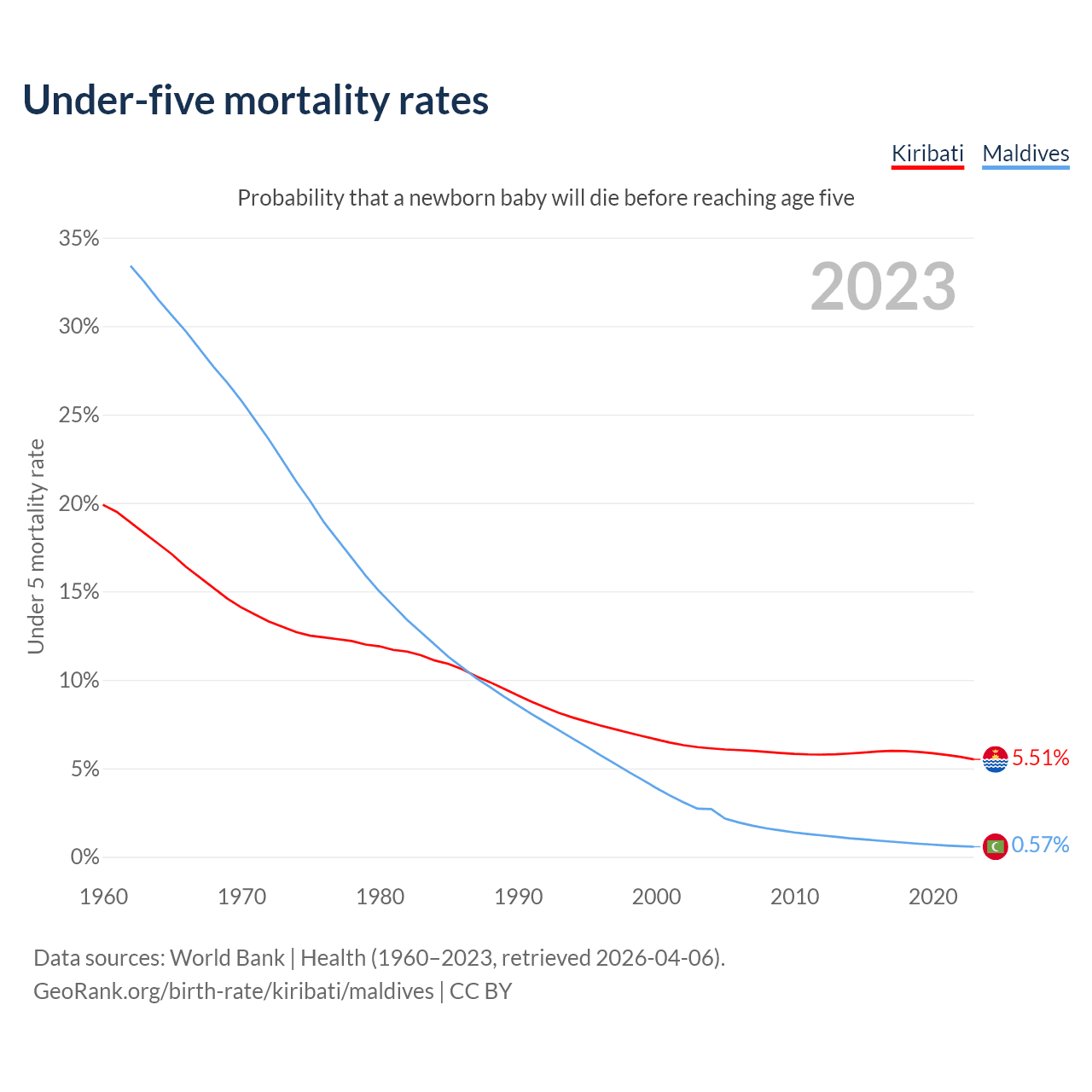 The chance that a newborn baby will die before reaching age five is 5.51% in Kiribati and 0.57% in Maldives. Above is a chart with historical data on under-five mortality rates.