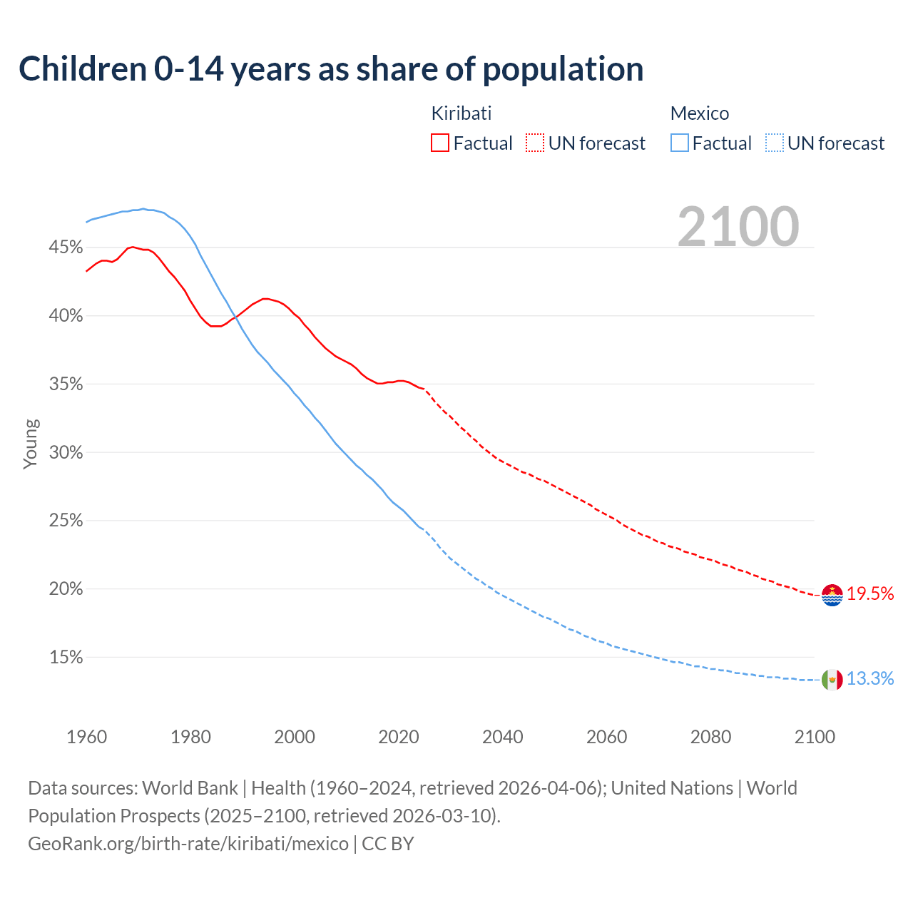 Kiribati has an annual birth rate of 25.8 births per 1,000 people, compared to 15.7 for Mexico. The average number of children a woman is expected to have during her lifetime — the fertility rate, is 3.15 in Kiribati and 1.91 in Mexico — 39.3% difference.