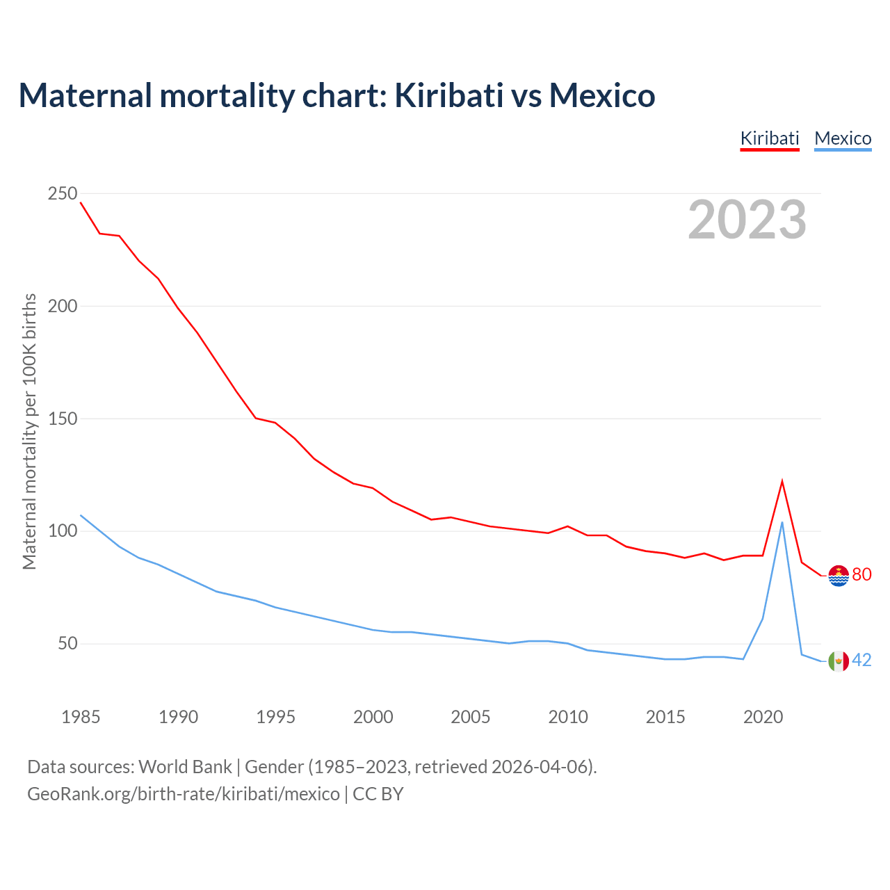 The maternal mortality rate, which is the probability of dying during childbirth or within 42 days of pregnancy termination, is 80 deaths per 100,000 live births in Kiribati, compared to 42 deaths in Mexico.