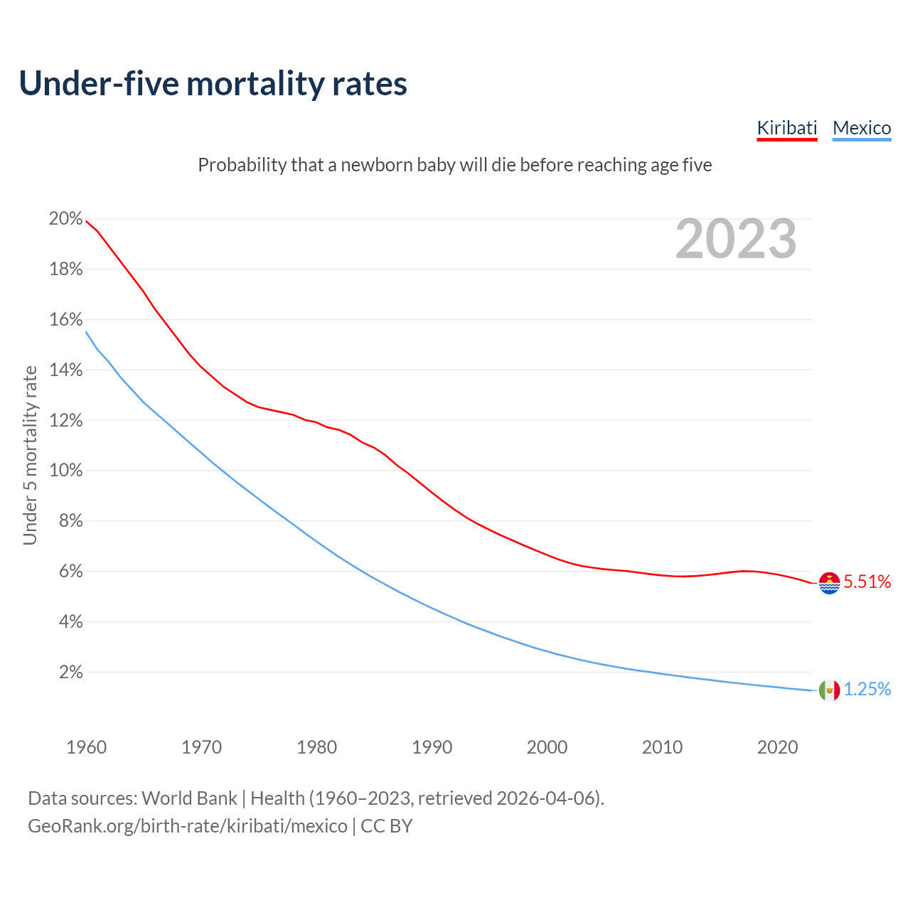 The chance that a newborn baby will die before reaching age five is 5.51% in Kiribati and 1.25% in Mexico. Above is a chart with historical data on under-five mortality rates.