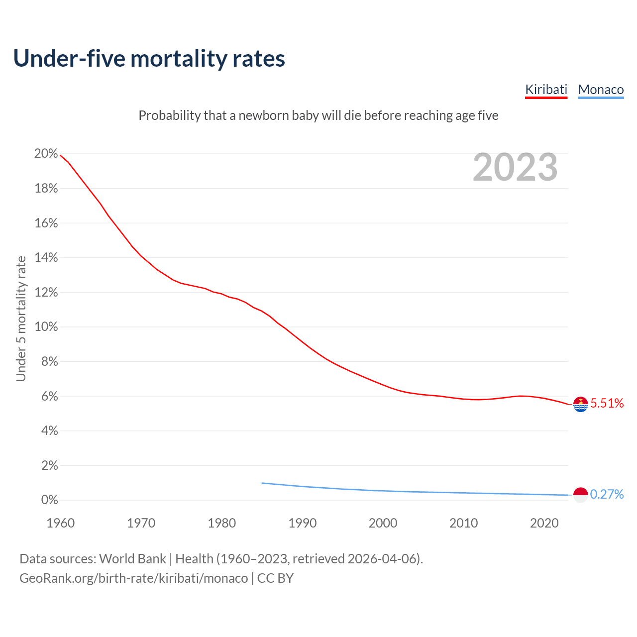 The chance that a newborn baby will die before reaching age five is 5.51% in Kiribati and 0.27% in Monaco. Above is a chart with historical data on under-five mortality rates.