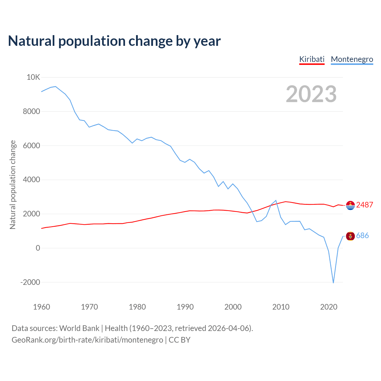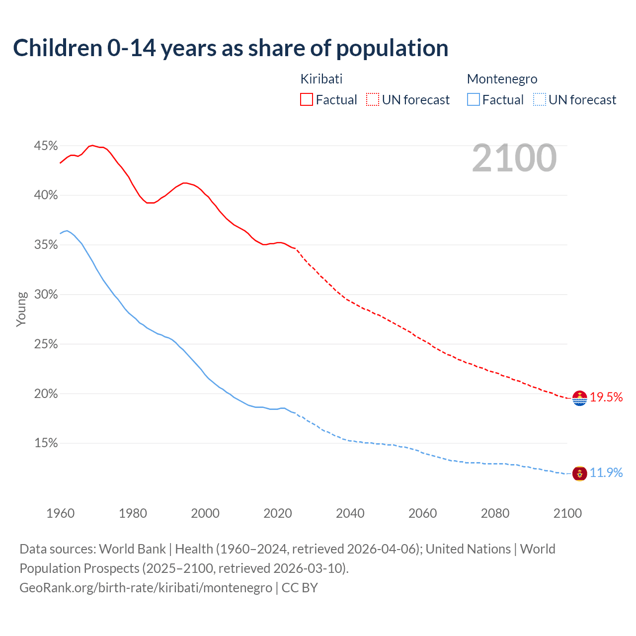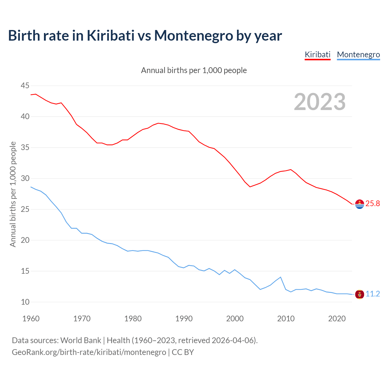 Kiribati has an annual birth rate of 25.8 births per 1,000 people, compared to 11.2 for Montenegro. The average number of children a woman is expected to have during her lifetime — the fertility rate, is 3.15 in Kiribati and 1.74 in Montenegro — 44.7% difference.