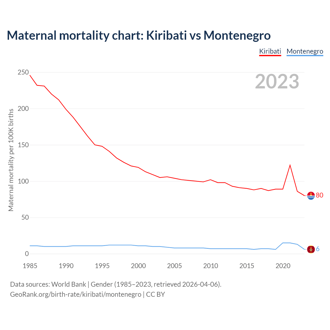 The maternal mortality rate, which is the probability of dying during childbirth or within 42 days of pregnancy termination, is 80 deaths per 100,000 live births in Kiribati, compared to 6 deaths in Montenegro.