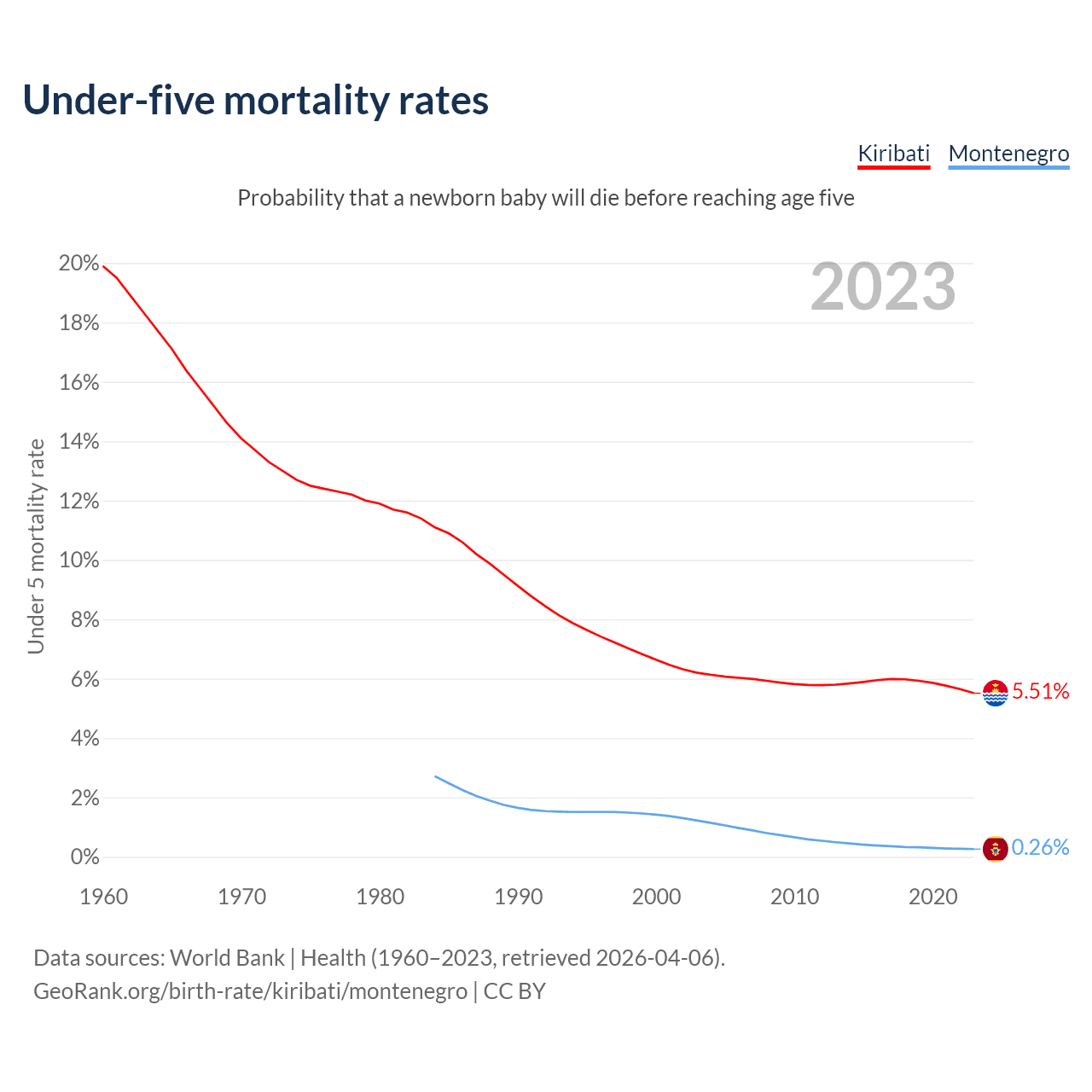 The chance that a newborn baby will die before reaching age five is 5.51% in Kiribati and 0.26% in Montenegro. Above is a chart with historical data on under-five mortality rates.