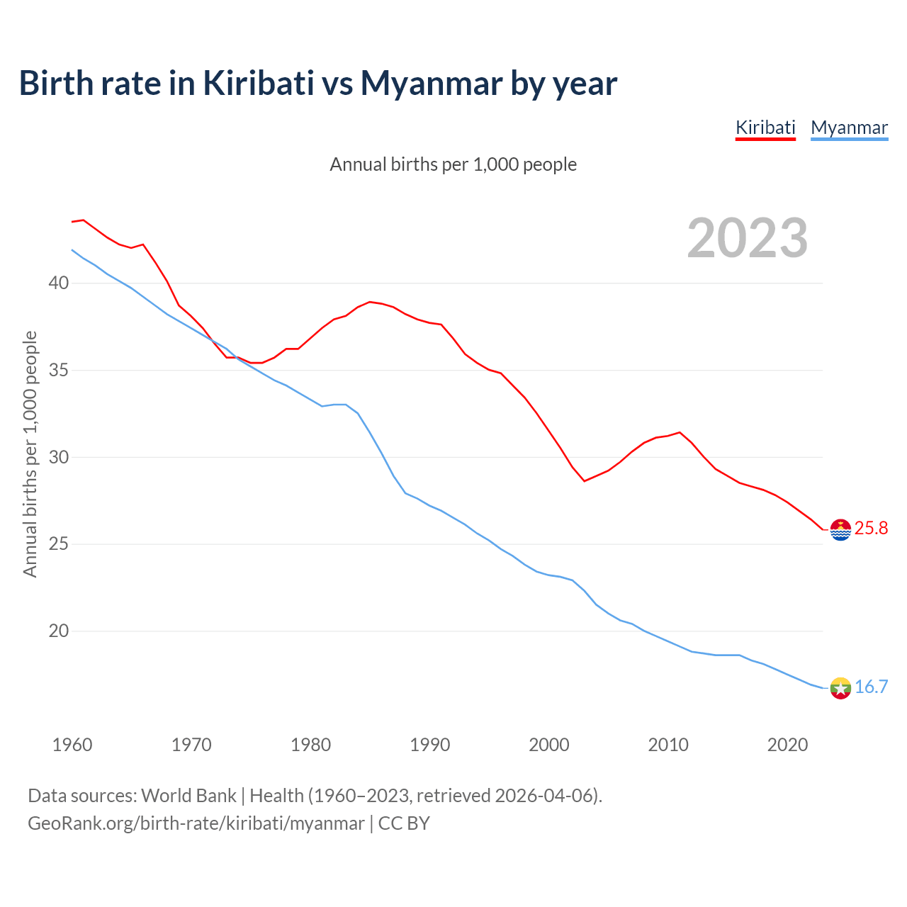 Kiribati has an annual birth rate of 25.8 births per 1,000 people, compared to 16.7 for Myanmar. The average number of children a woman is expected to have during her lifetime — the fertility rate, is 3.15 in Kiribati and 2.12 in Myanmar — 32.8% difference.