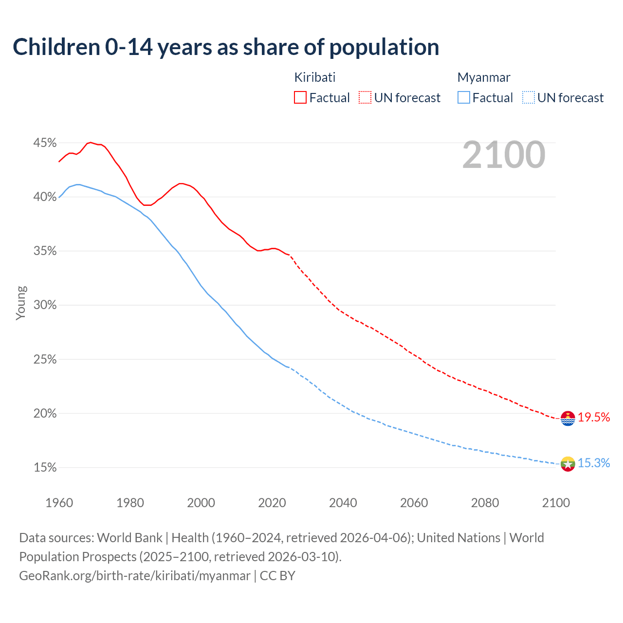 According to the latest available data on birth rates, the fertility rate in Kiribati was 3.15 children per woman in 2023, compared to 2.12 in Myanmar in 2023. The replacement level is considered to be 2.1 children per woman.