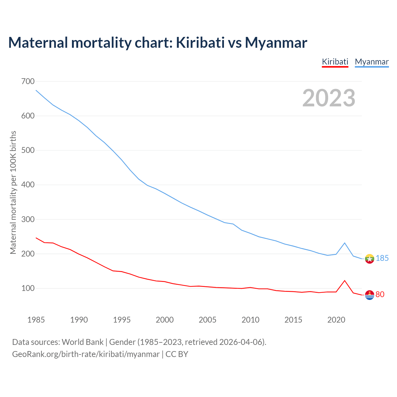 The maternal mortality rate, which is the probability of dying during childbirth or within 42 days of pregnancy termination, is 80 deaths per 100,000 live births in Kiribati, compared to 185 deaths in Myanmar.