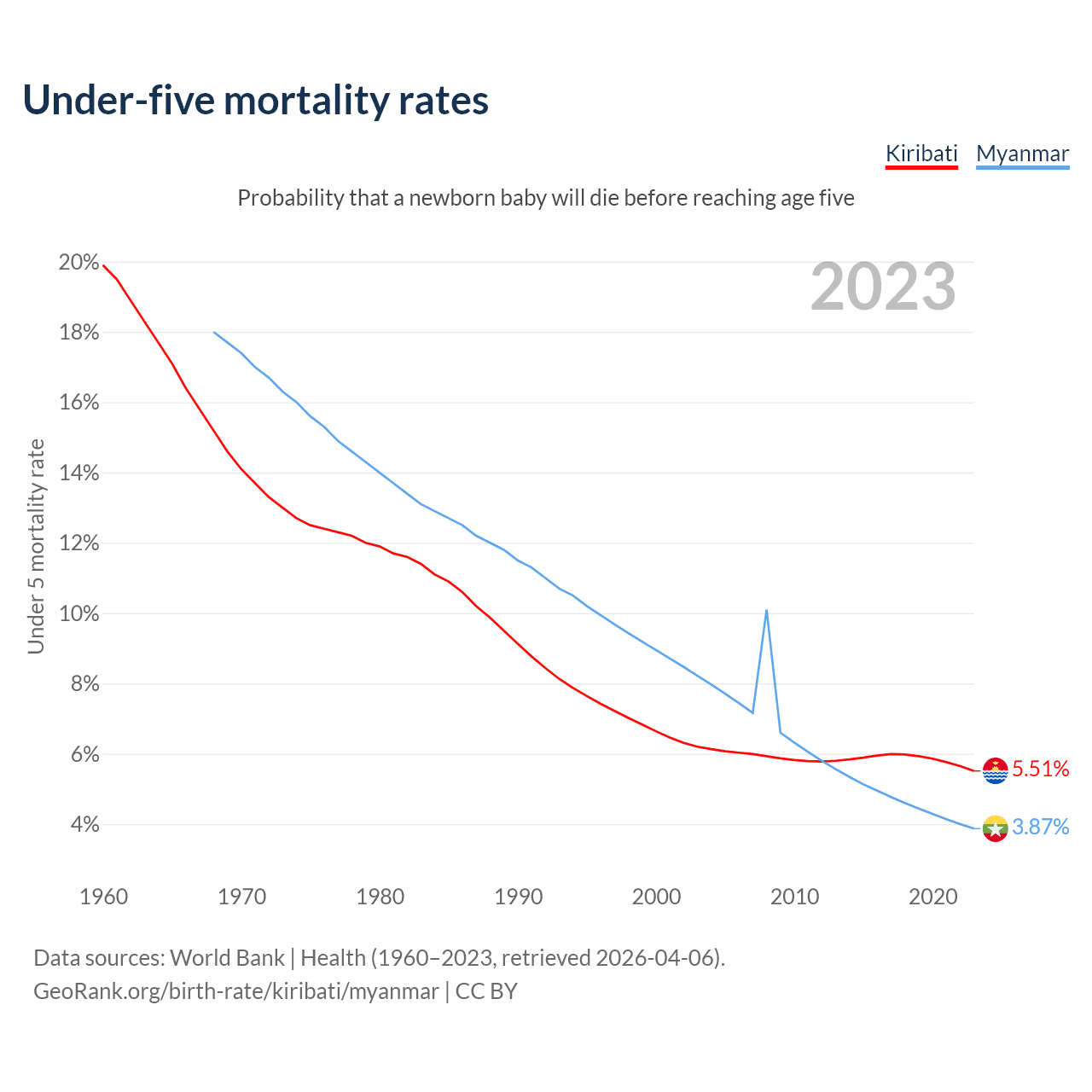 The chance that a newborn baby will die before reaching age five is 5.51% in Kiribati and 3.87% in Myanmar. Above is a chart with historical data on under-five mortality rates.