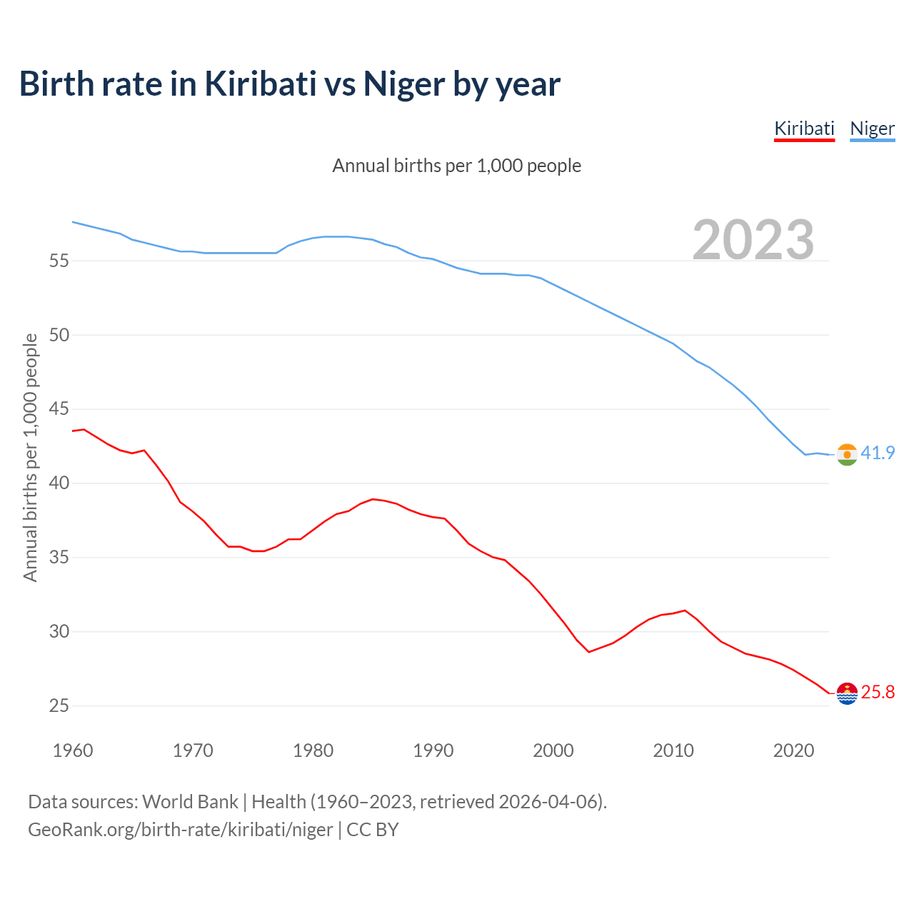 Kiribati has an annual birth rate of 25.8 births per 1,000 people, compared to 41.9 for Niger. The average number of children a woman is expected to have during her lifetime — the fertility rate, is 3.15 in Kiribati and 6.06 in Niger — 92.6% difference.