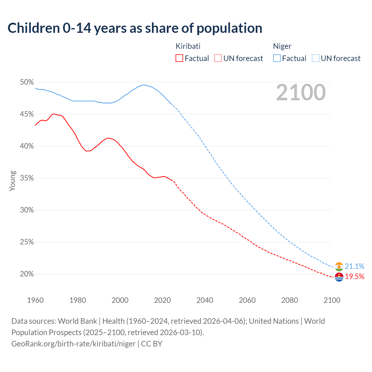 According to the latest available data on birth rates, the fertility rate in Kiribati was 3.15 children per woman in 2023, compared to 6.06 in Niger in 2023. The replacement level is considered to be 2.1 children per woman.