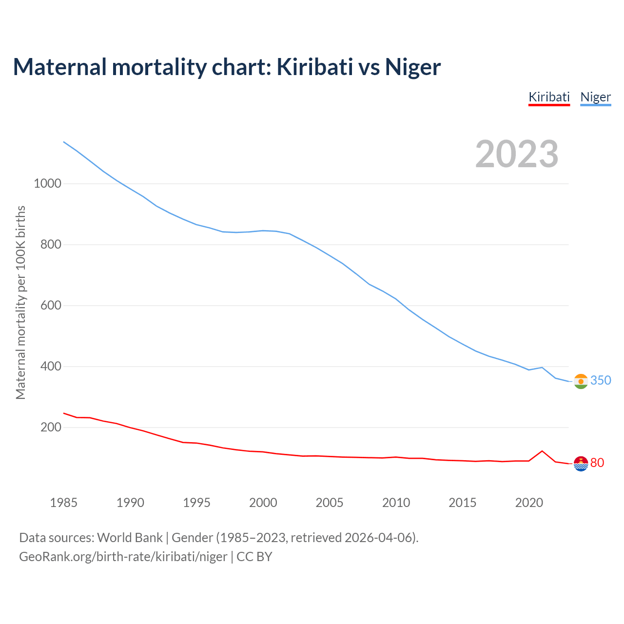 The maternal mortality rate, which is the probability of dying during childbirth or within 42 days of pregnancy termination, is 80 deaths per 100,000 live births in Kiribati, compared to 350 deaths in Niger.