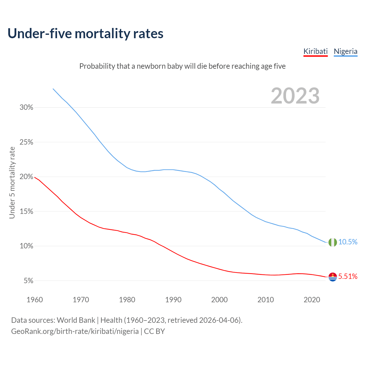 The chance that a newborn baby will die before reaching age five is 5.51% in Kiribati and 10.5% in Nigeria. Above is a chart with historical data on under-five mortality rates.