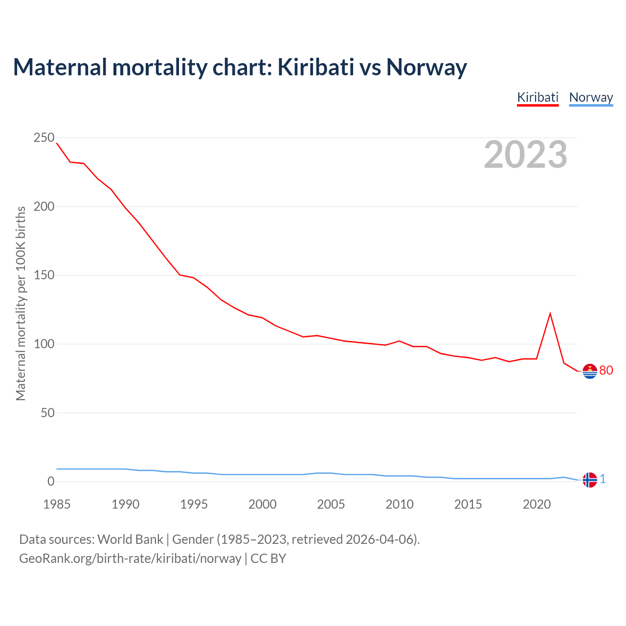 The maternal mortality rate, which is the probability of dying during childbirth or within 42 days of pregnancy termination, is 80 deaths per 100,000 live births in Kiribati, compared to 1 deaths in Norway.