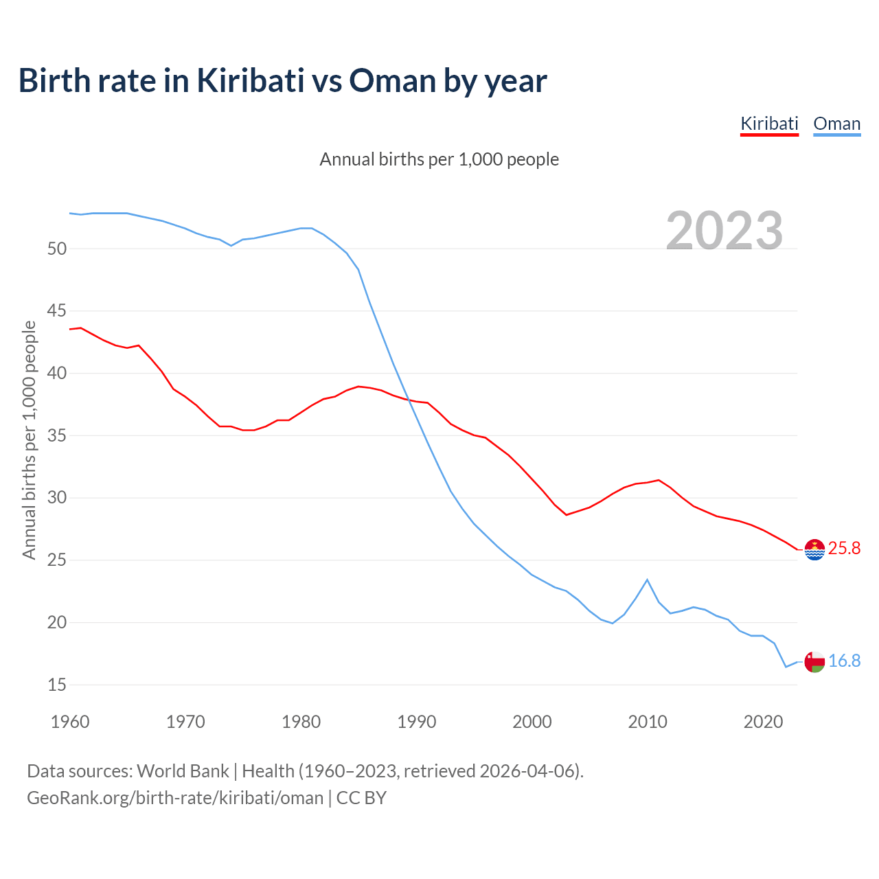 Kiribati has an annual birth rate of 25.8 births per 1,000 people, compared to 16.8 for Oman. The average number of children a woman is expected to have during her lifetime — the fertility rate, is 3.15 in Kiribati and 2.53 in Oman — 19.8% difference.
