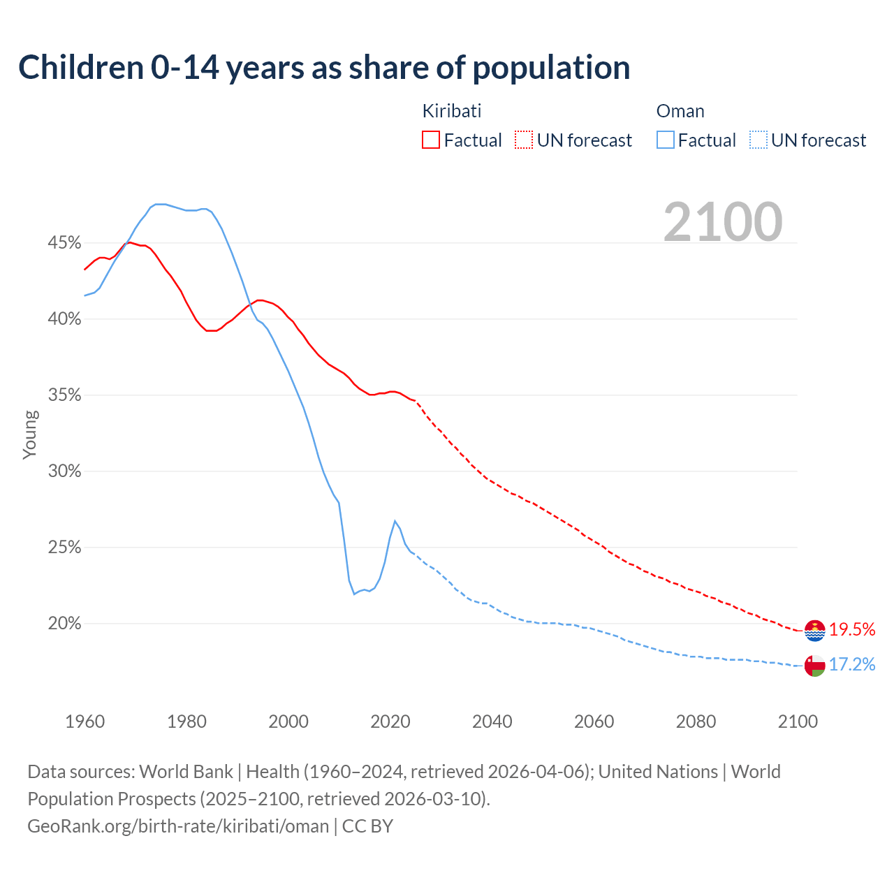 According to the latest available data on birth rates, the fertility rate in Kiribati was 3.15 children per woman in 2023, compared to 2.53 in Oman in 2023. The replacement level is considered to be 2.1 children per woman.
