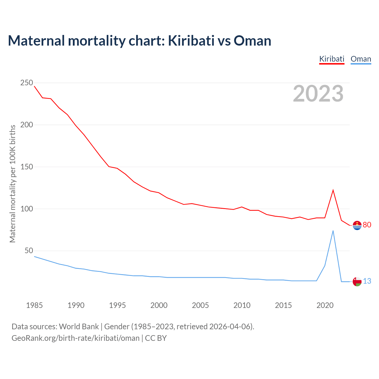 The maternal mortality rate, which is the probability of dying during childbirth or within 42 days of pregnancy termination, is 80 deaths per 100,000 live births in Kiribati, compared to 13 deaths in Oman.