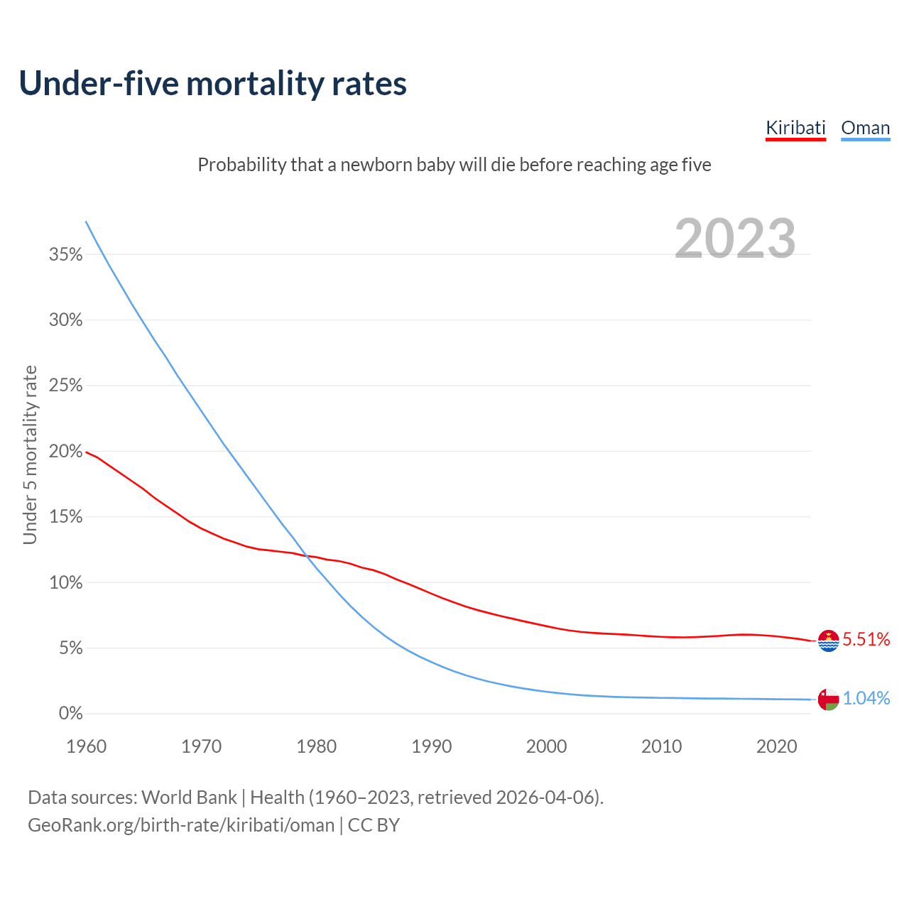 The chance that a newborn baby will die before reaching age five is 5.51% in Kiribati and 1.04% in Oman. Above is a chart with historical data on under-five mortality rates.