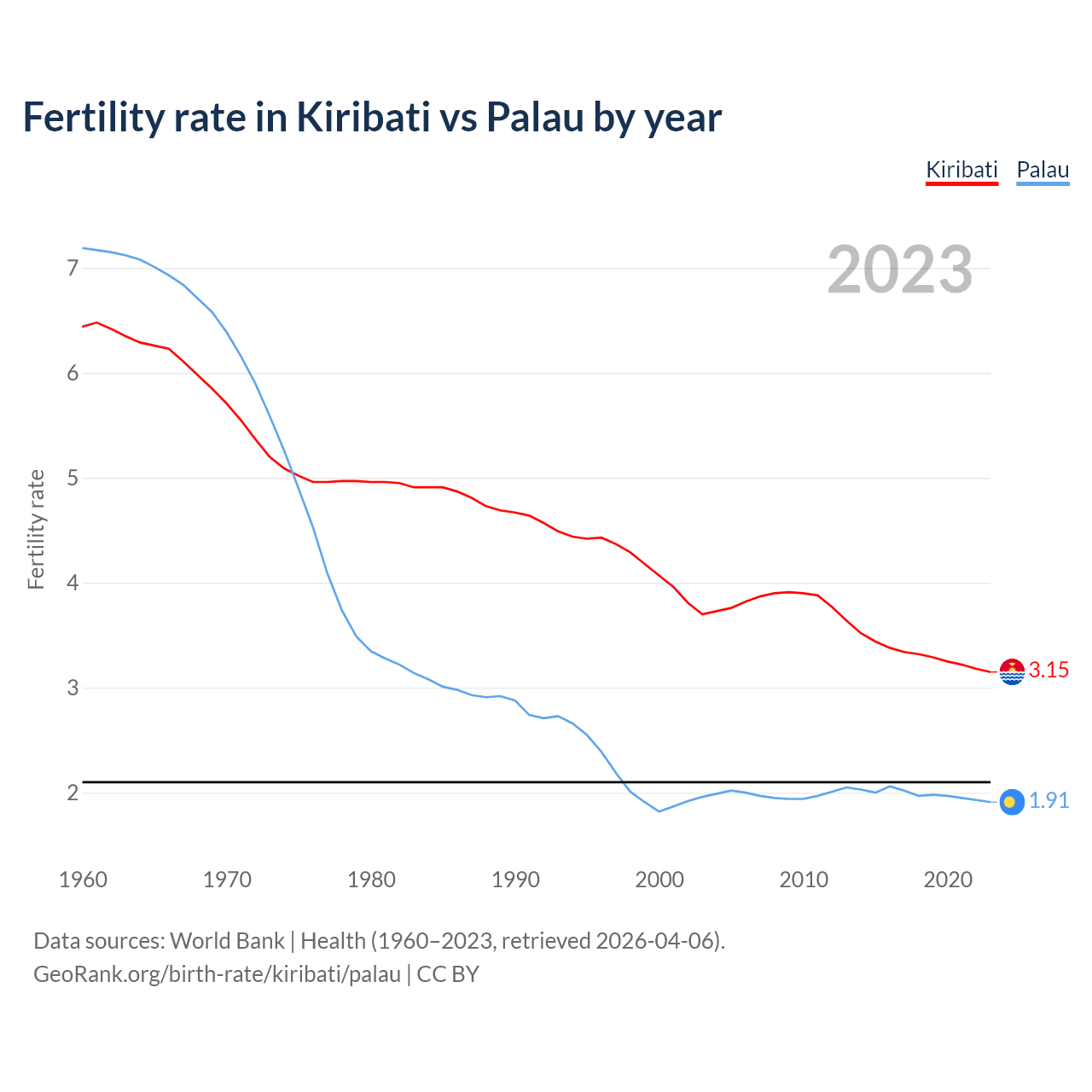 1960 vs 2023, the fertility rate has decreased by 51.1% in Kiribati and by 73.5% in Palau — in 1960, it was 6.44 and 7.19, respectively.