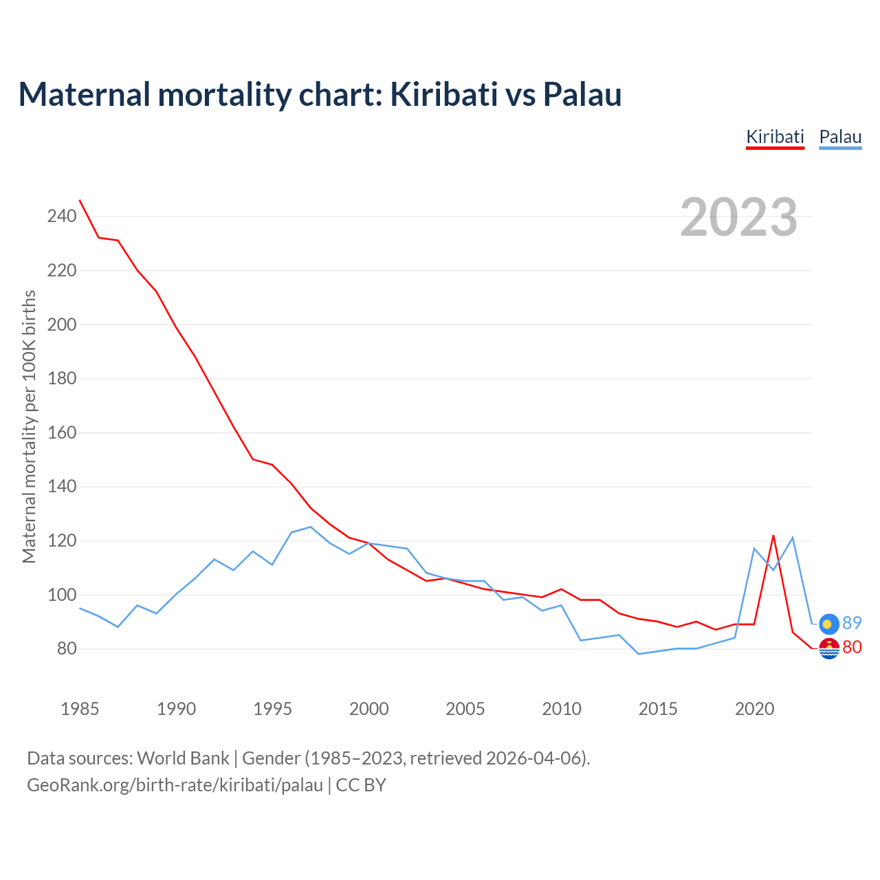 The maternal mortality rate, which is the probability of dying during childbirth or within 42 days of pregnancy termination, is 80 deaths per 100,000 live births in Kiribati, compared to 89 deaths in Palau.