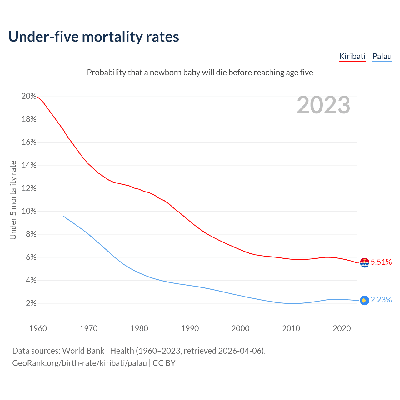 The chance that a newborn baby will die before reaching age five is 5.51% in Kiribati and 2.23% in Palau. Above is a chart with historical data on under-five mortality rates.