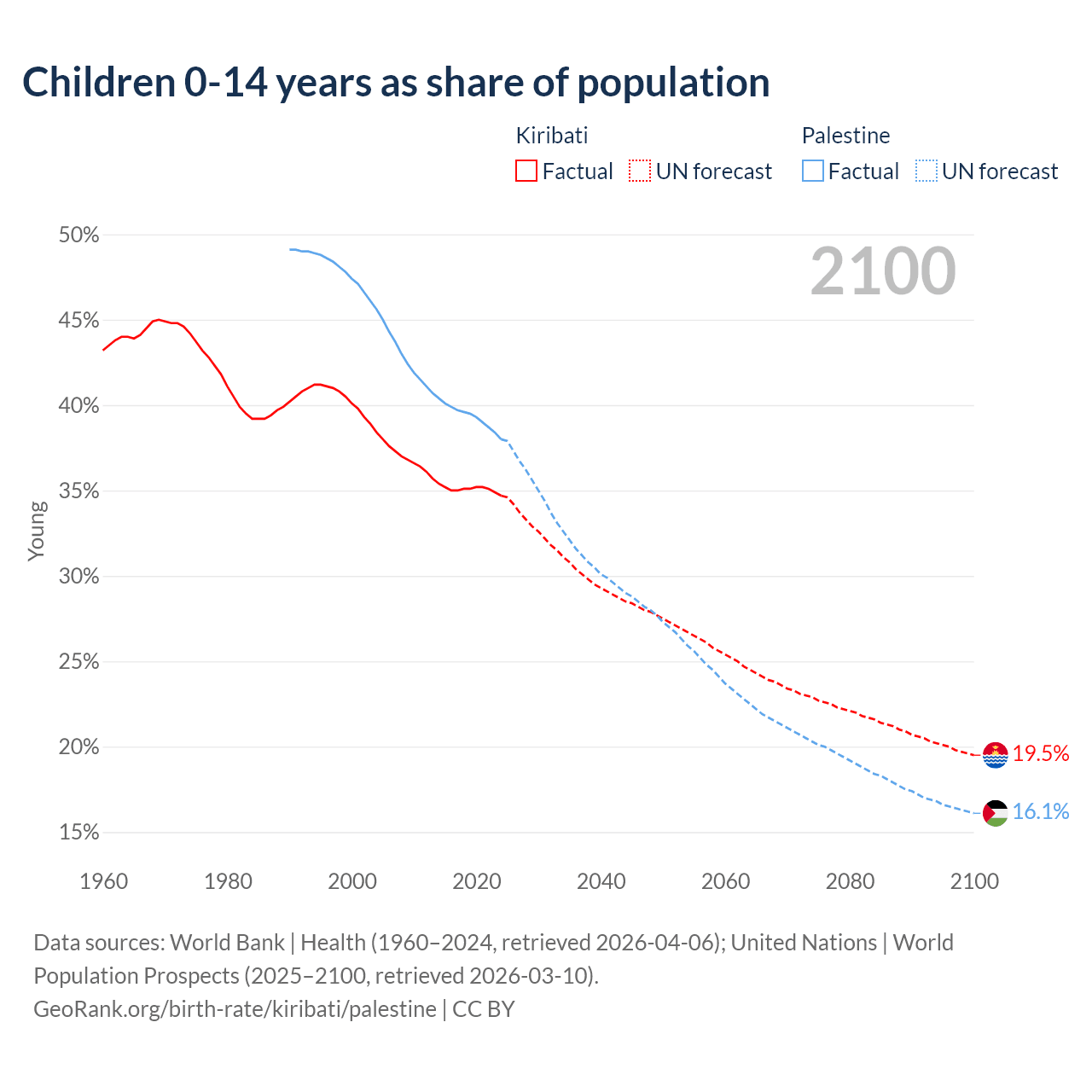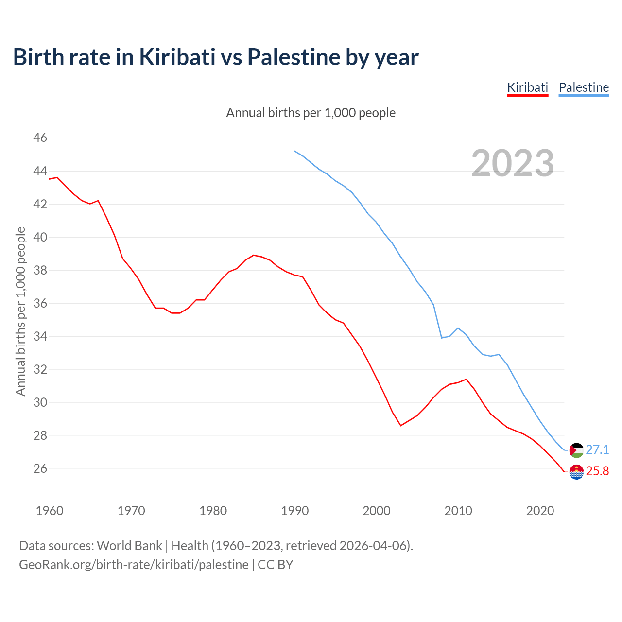 According to the latest available data on birth rates, the fertility rate in Kiribati was 3.15 children per woman in 2023, compared to 3.31 in Palestine in 2023. The replacement level is considered to be 2.1 children per woman.