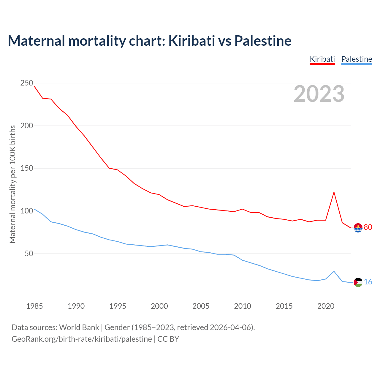 The maternal mortality rate, which is the probability of dying during childbirth or within 42 days of pregnancy termination, is 80 deaths per 100,000 live births in Kiribati, compared to 16 deaths in Palestine.