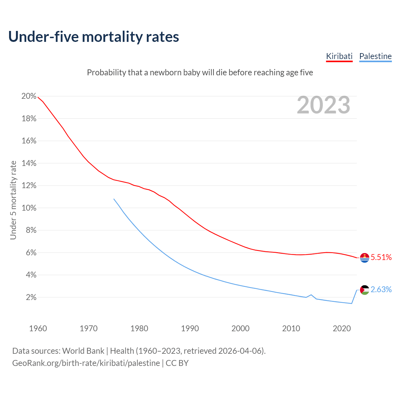 The chance that a newborn baby will die before reaching age five is 5.51% in Kiribati and 2.63% in Palestine. Above is a chart with historical data on under-five mortality rates.