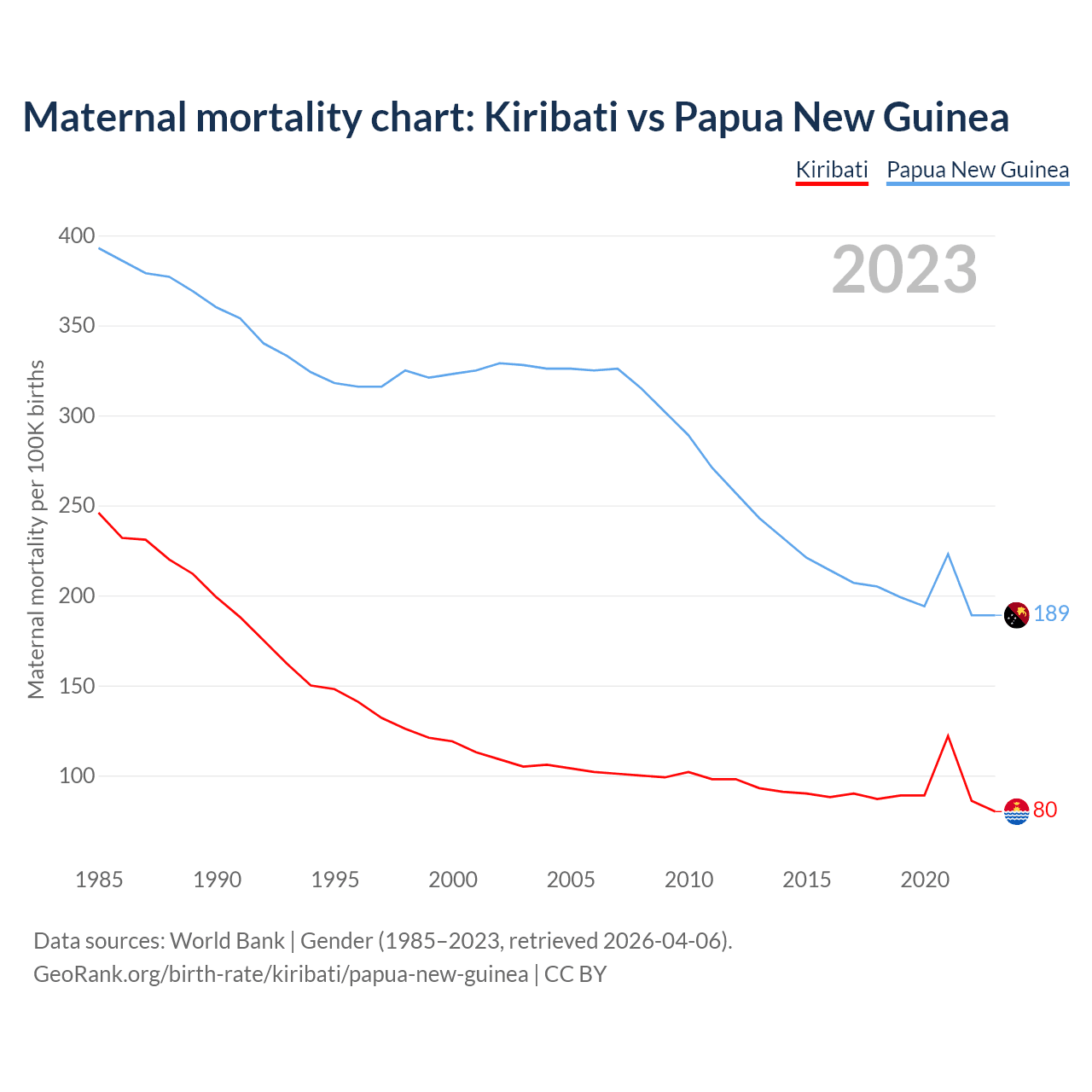 The maternal mortality rate, which is the probability of dying during childbirth or within 42 days of pregnancy termination, is 80 deaths per 100,000 live births in Kiribati, compared to 189 deaths in Papua New Guinea.