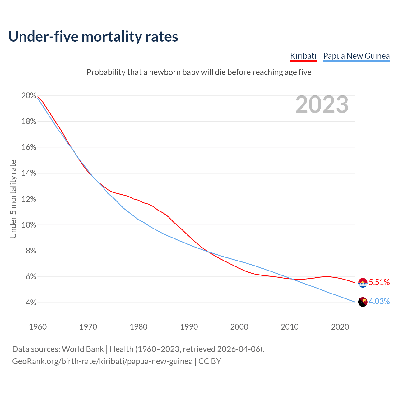 The chance that a newborn baby will die before reaching age five is 5.51% in Kiribati and 4.03% in Papua New Guinea. Above is a chart with historical data on under-five mortality rates.