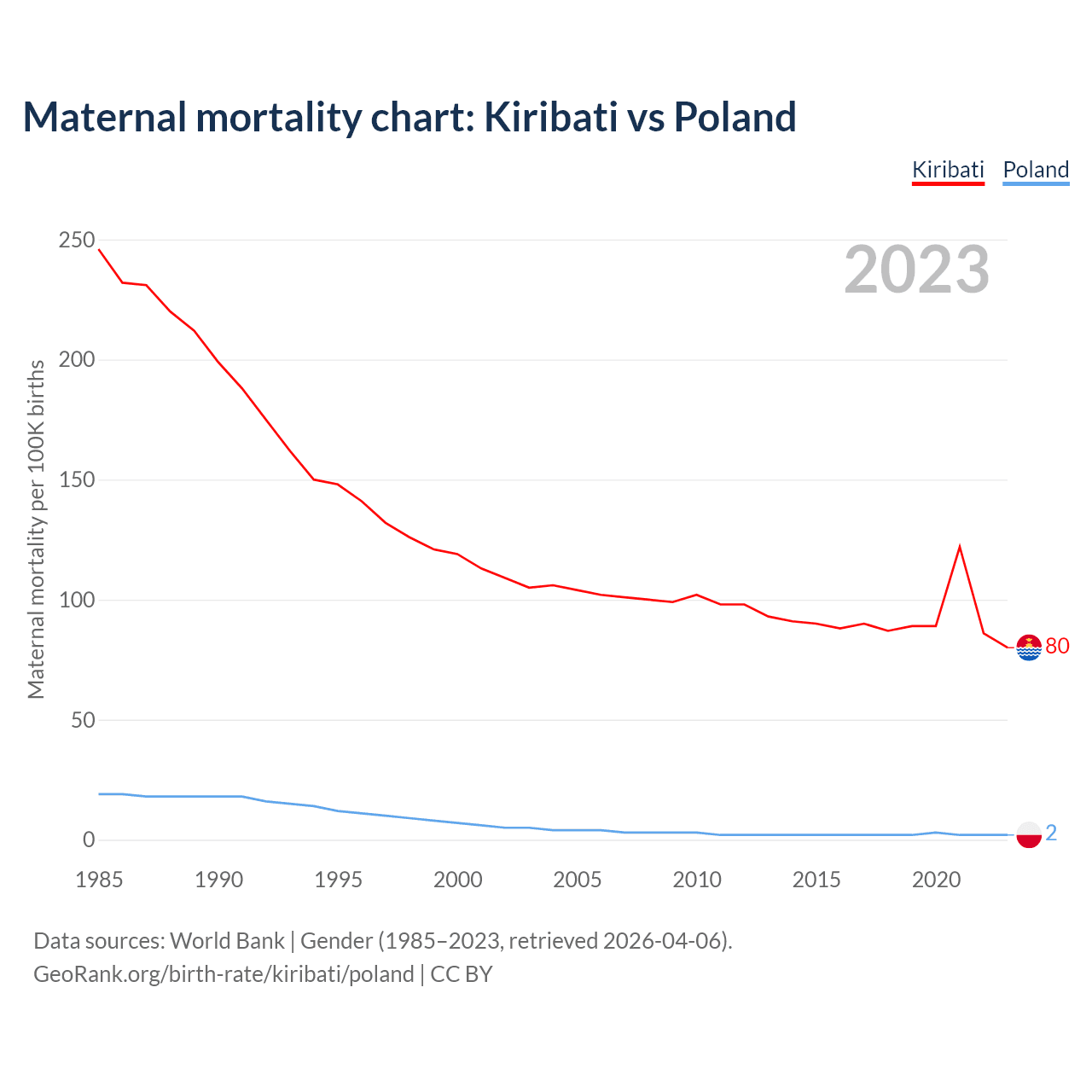 The maternal mortality rate, which is the probability of dying during childbirth or within 42 days of pregnancy termination, is 80 deaths per 100,000 live births in Kiribati, compared to 2 deaths in Poland.