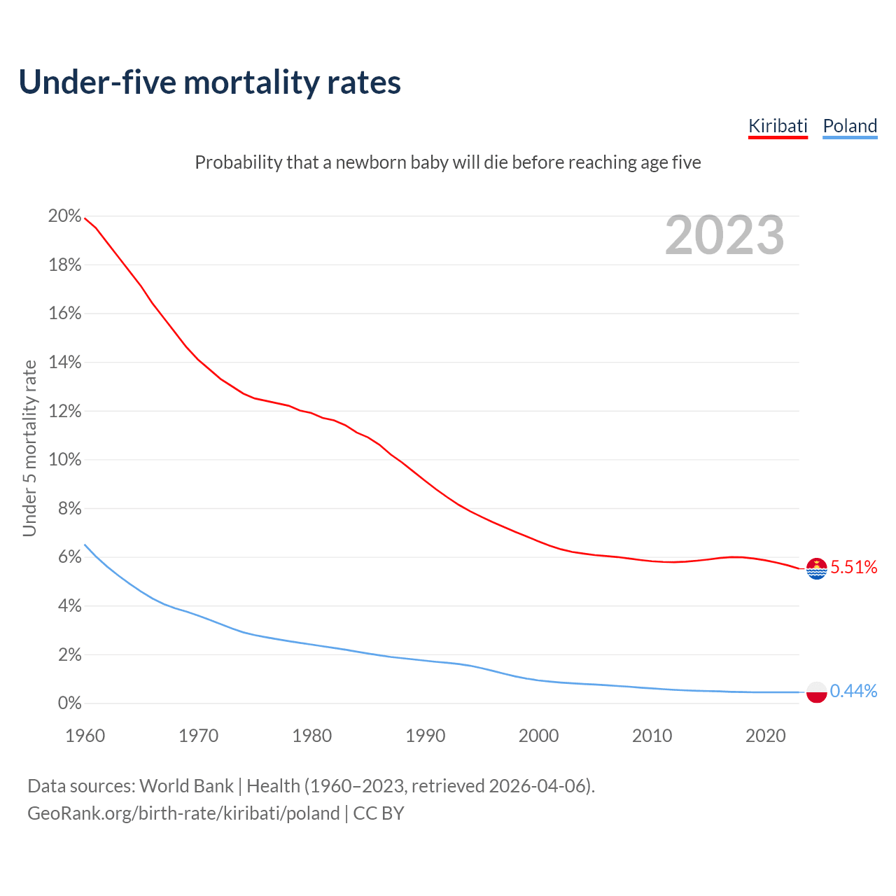 The chance that a newborn baby will die before reaching age five is 5.51% in Kiribati and 0.44% in Poland. Above is a chart with historical data on under-five mortality rates.