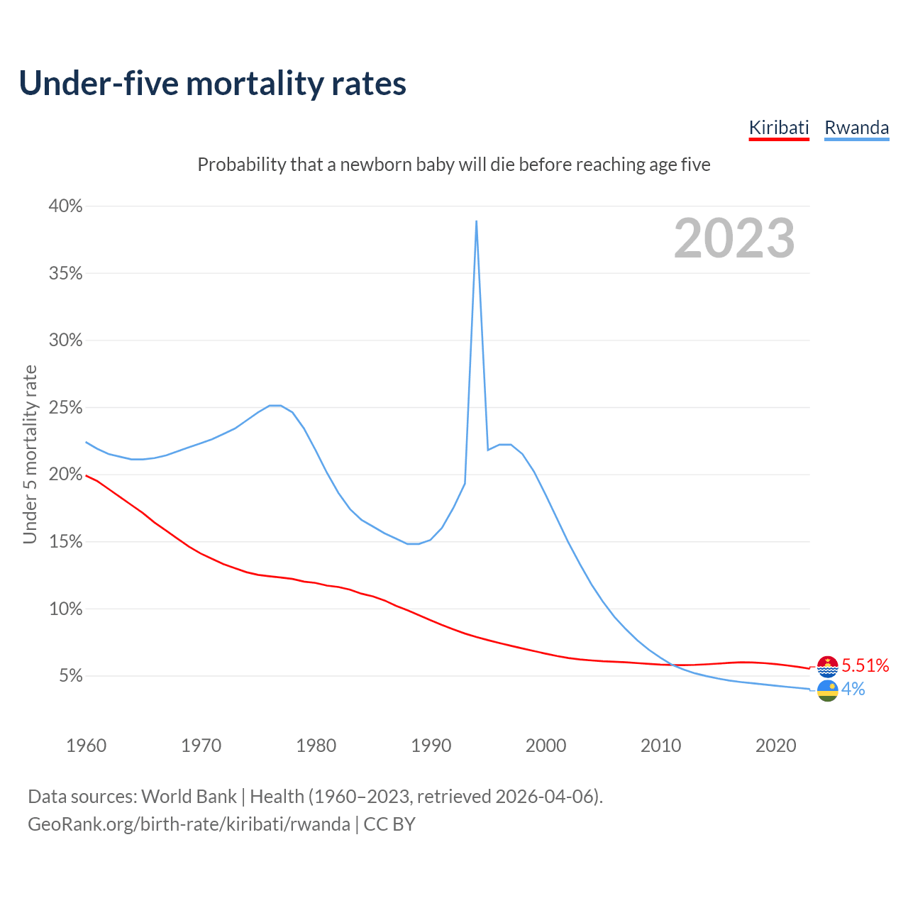 The chance that a newborn baby will die before reaching age five is 5.51% in Kiribati and 4% in Rwanda. Above is a chart with historical data on under-five mortality rates.