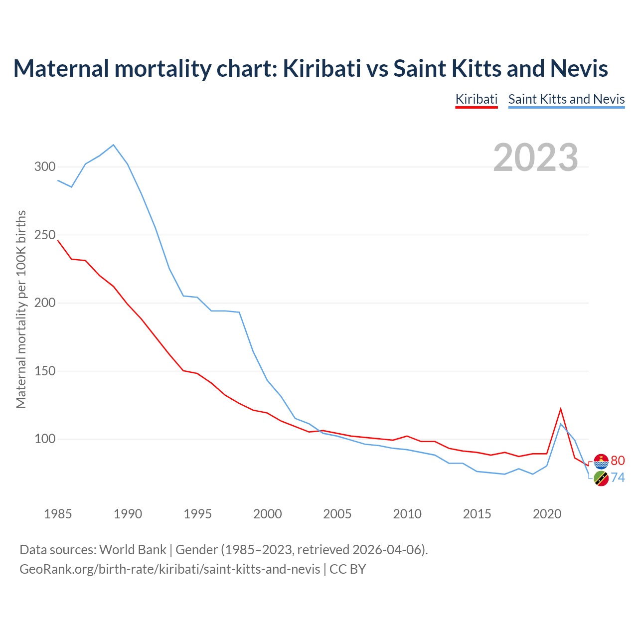 The maternal mortality rate, which is the probability of dying during childbirth or within 42 days of pregnancy termination, is 80 deaths per 100,000 live births in Kiribati, compared to 74 deaths in Saint Kitts and Nevis.