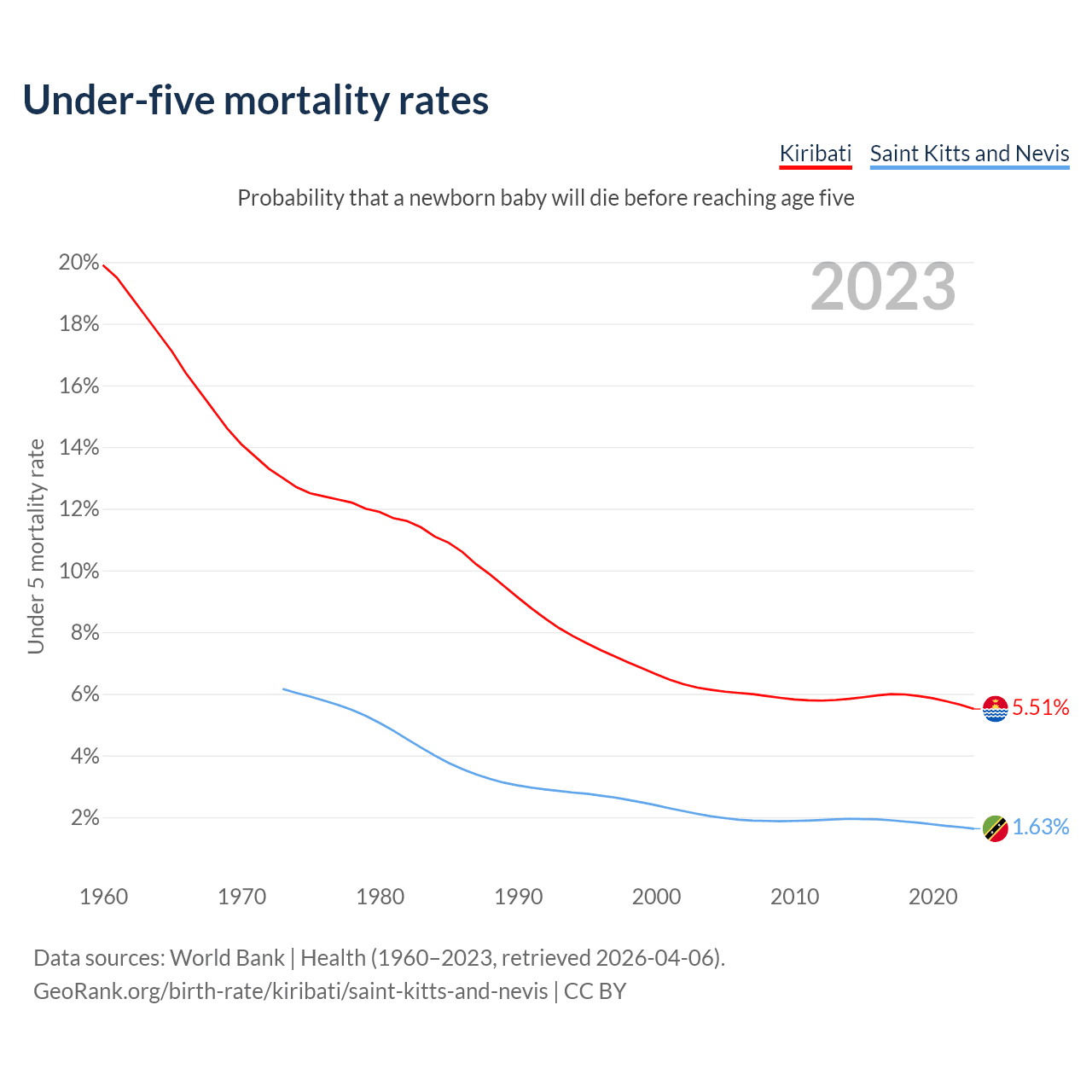 The chance that a newborn baby will die before reaching age five is 5.51% in Kiribati and 1.63% in Saint Kitts and Nevis. Above is a chart with historical data on under-five mortality rates.