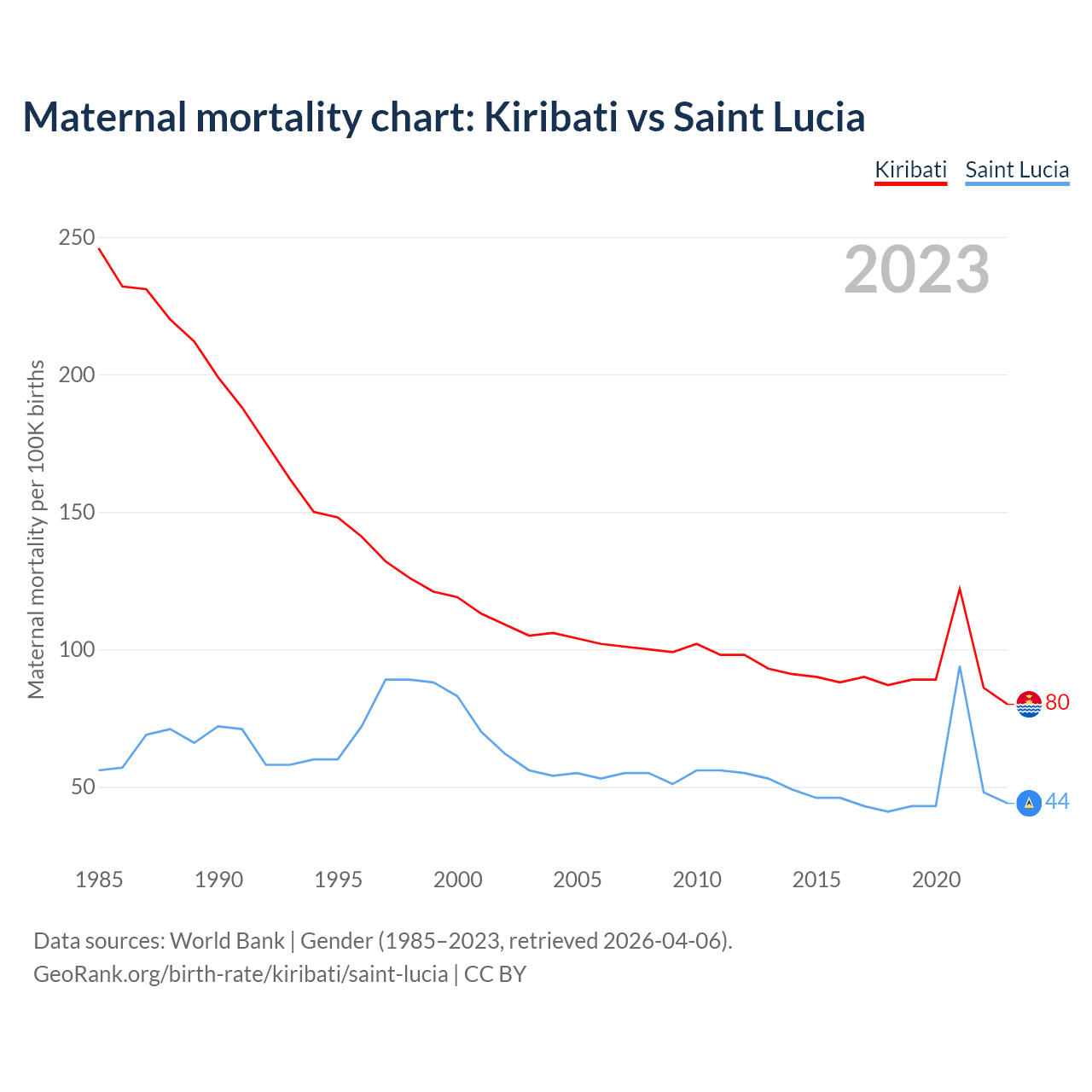 The maternal mortality rate, which is the probability of dying during childbirth or within 42 days of pregnancy termination, is 80 deaths per 100,000 live births in Kiribati, compared to 44 deaths in Saint Lucia.