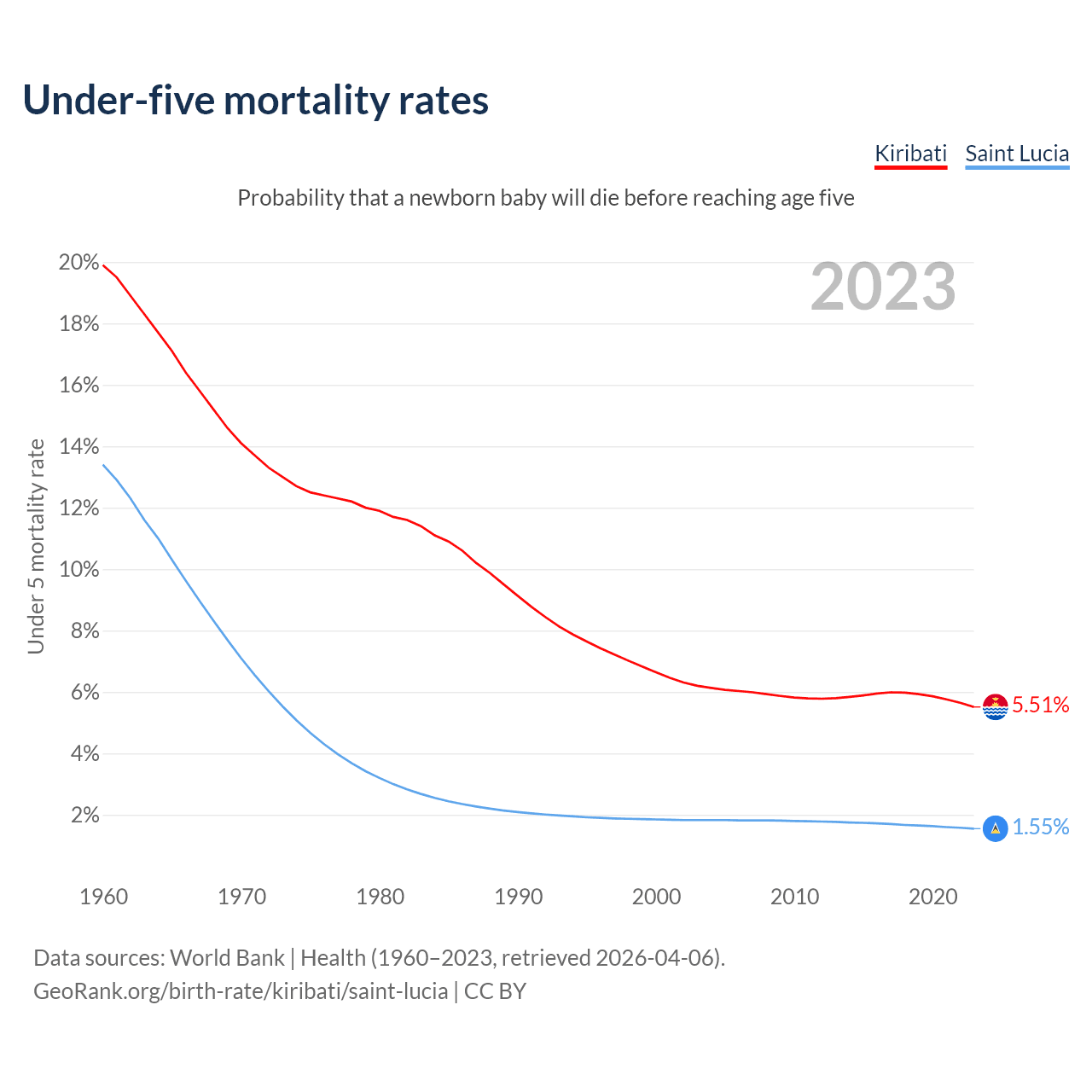 The chance that a newborn baby will die before reaching age five is 5.51% in Kiribati and 1.55% in Saint Lucia. Above is a chart with historical data on under-five mortality rates.
