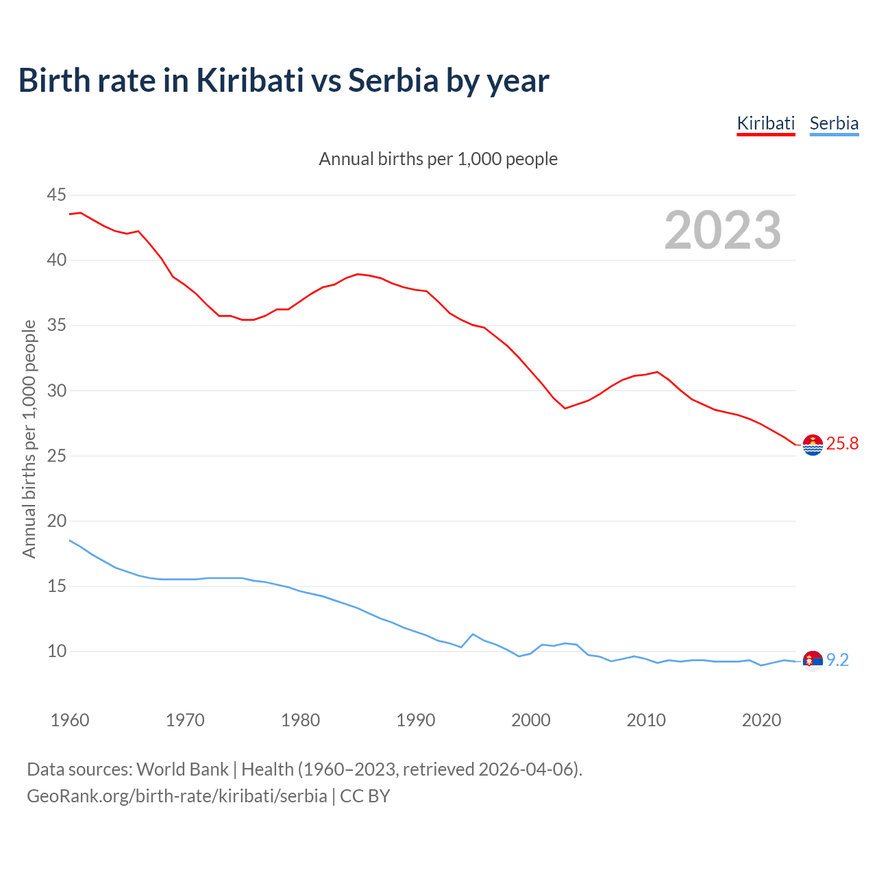 Kiribati has an annual birth rate of 25.8 births per 1,000 people, compared to 9.2 for Serbia. The average number of children a woman is expected to have during her lifetime — the fertility rate, is 3.15 in Kiribati and 1.61 in Serbia — 48.8% difference.