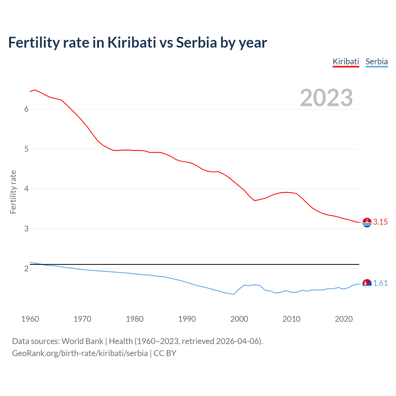 According to the latest available data on birth rates, the fertility rate in Kiribati was 3.15 children per woman in 2023, compared to 1.61 in Serbia in 2023. The replacement level is considered to be 2.1 children per woman.