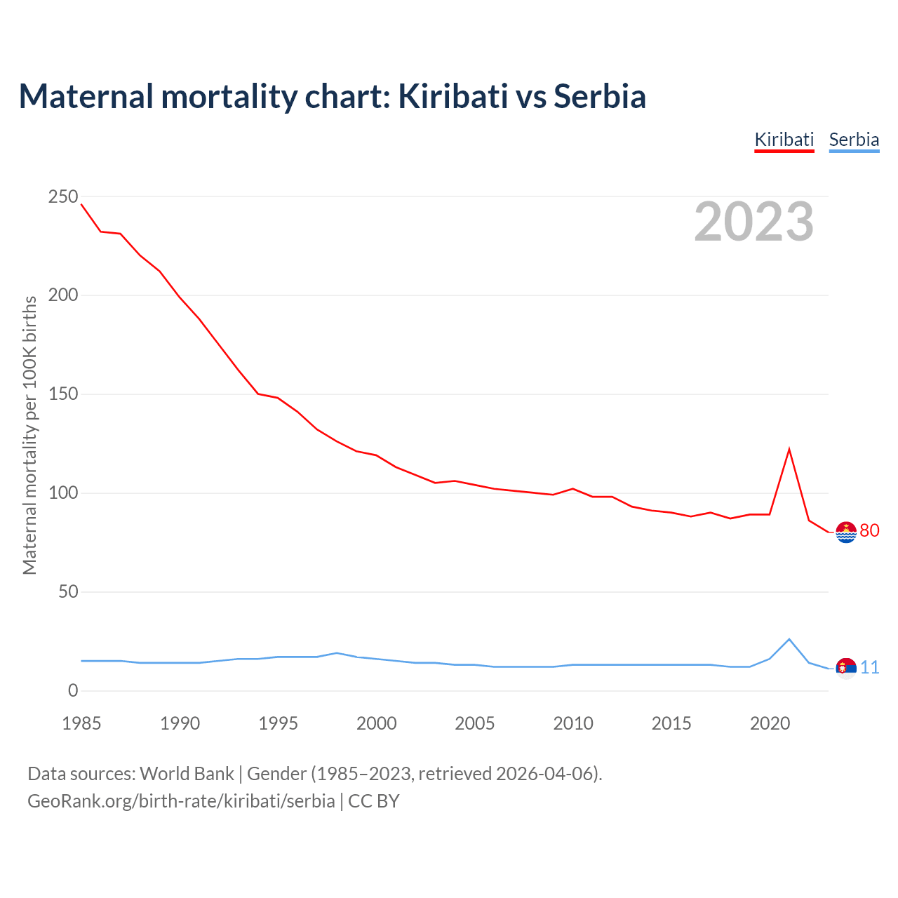 The maternal mortality rate, which is the probability of dying during childbirth or within 42 days of pregnancy termination, is 80 deaths per 100,000 live births in Kiribati, compared to 11 deaths in Serbia.