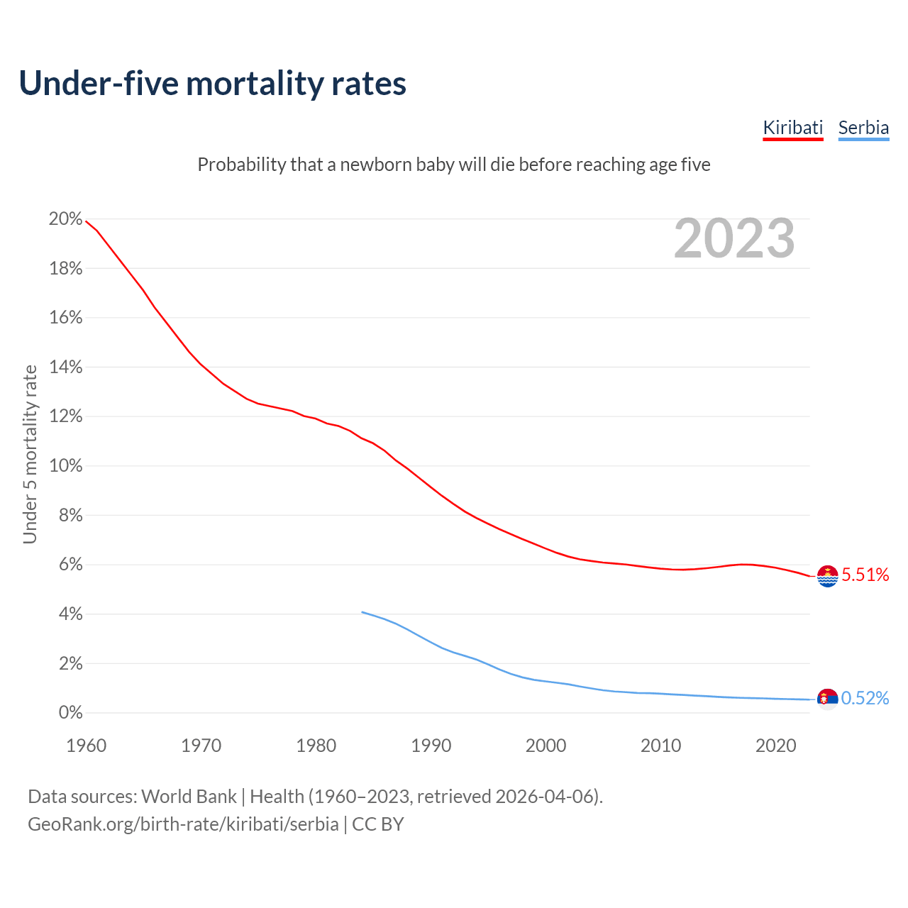 The chance that a newborn baby will die before reaching age five is 5.51% in Kiribati and 0.52% in Serbia. Above is a chart with historical data on under-five mortality rates.